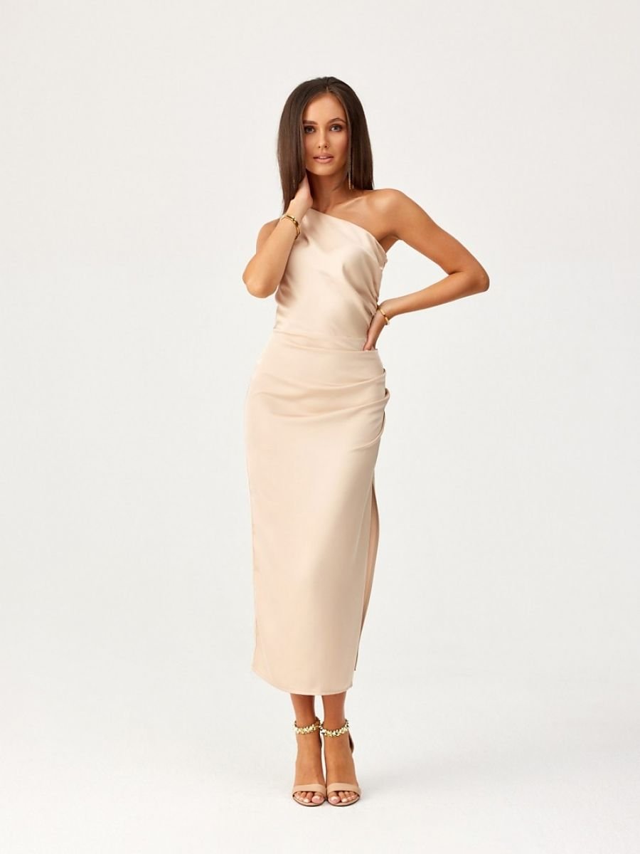 Sukienka midi na jedno ramię z subtelnym rozcięciem przy nodze wykonana jest z delikatnej satynowej tkaniny. Po boku marszczenie, które idealnie tuszuje ewentualne niedoskonałości. Szerokie ramiączko z marszczeniami na jednym ramieniu nadaje jej wyjątkowy charakter. Zapinana na kryty zamek błyskawiczny z boku sukienki. Ta midi sukienka jest nie tylko elegancka, ale także funkcjonalna. Długość midi nadaje sukience wytwornego, kobiecego stylu. Ten krój sukienki pozwoli Ci czuć się oryginalnie podkreślając Twój indywidualny styl i z pewnością przyciągnie uwagę wyróżniając Cię z tłumu niezależnie od okazji. Produkt jest wyprodukowany i uszyty w Polsce.