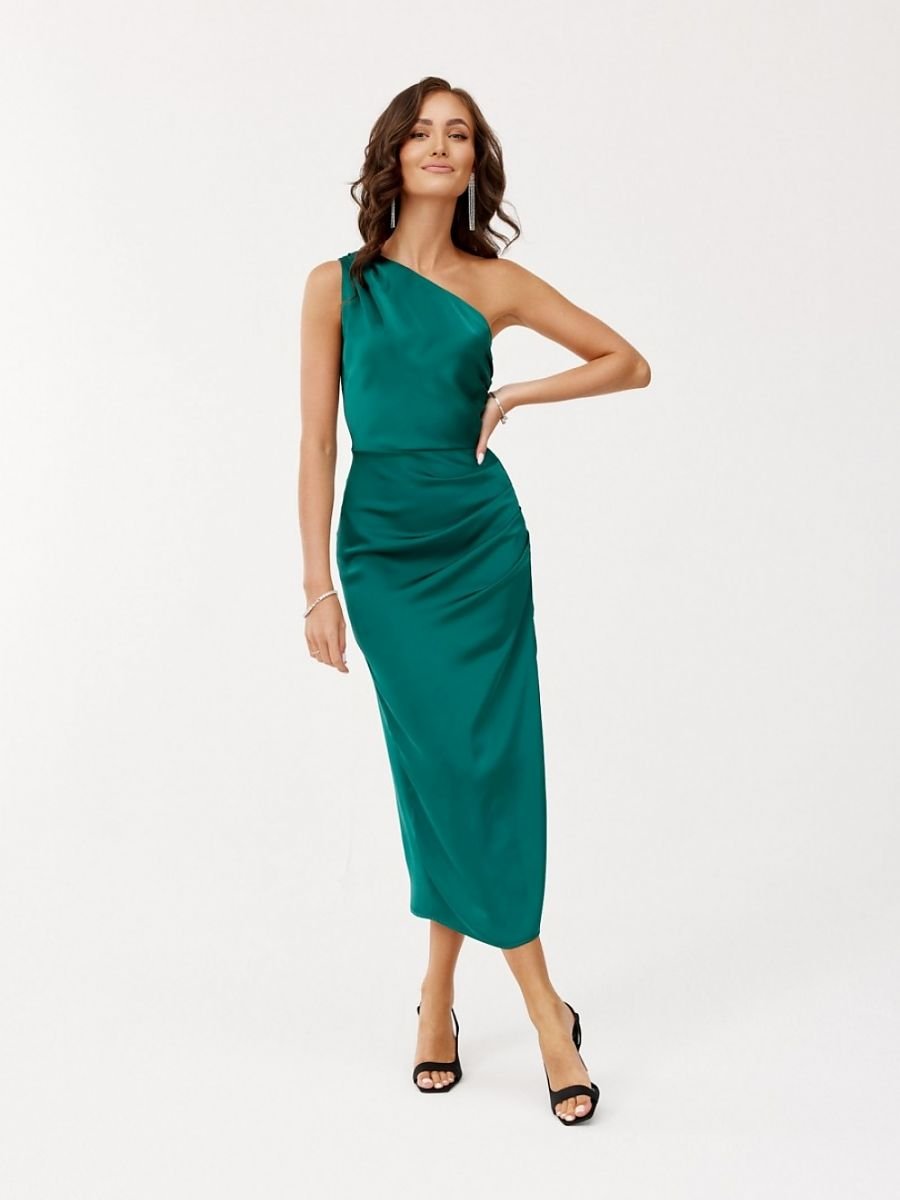 Sukienka midi na jedno ramię z subtelnym rozcięciem przy nodze wykonana jest z delikatnej satynowej tkaniny. Po boku marszczenie, które idealnie tuszuje ewentualne niedoskonałości. Szerokie ramiączko z marszczeniami na jednym ramieniu nadaje jej wyjątkowy charakter. Zapinana na kryty zamek błyskawiczny z boku sukienki. Ta midi sukienka jest nie tylko elegancka, ale także funkcjonalna. Długość midi nadaje sukience wytwornego, kobiecego stylu. Ten krój sukienki pozwoli Ci czuć się oryginalnie podkreślając Twój indywidualny styl i z pewnością przyciągnie uwagę wyróżniając Cię z tłumu niezależnie od okazji. Produkt jest wyprodukowany i uszyty w Polsce.