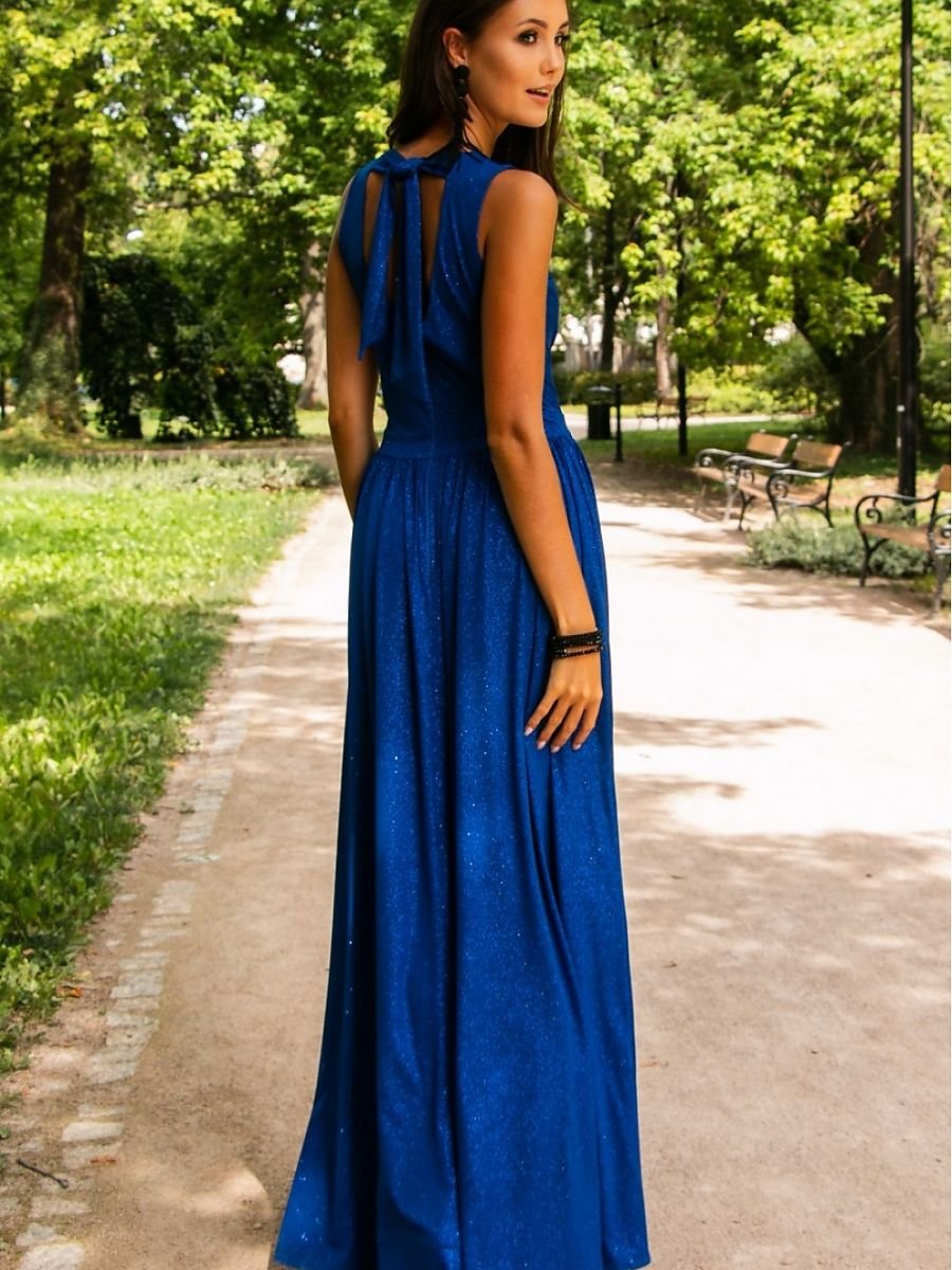 Brokatowa sukienka maxi z wiązaniem na plecach wyprodukowana jest z pięknej, mieniącej się tkaniny, która zapewni nam olśniewający wygląd. Sukienka cechuje się kopertowym dekoltem oraz rozcięciem na nogę, które dodaje zmysłowości. Sukienka posiada ozdobne wiązanie na plecach. Zapinana jest na kryty zamek błyskawiczny. Wieczorowa sukienka szczególnie dobrze wygląda na kobietach, które lubią błyszczeć i czuć się jak prawdziwa gwiazda. Długa sukienka będzie idealna na wszelkiego typu uroczystości, takie jak: wesele, komunia, impreza firmowa, sylwester. Produkt jest wyprodukowany i uszyty w Polsce.