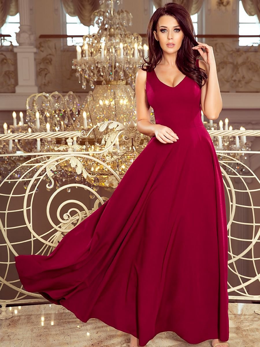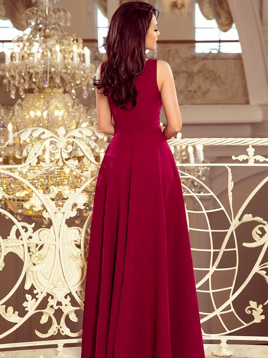 Cindy, długa suknia z dekoltem z przodu i na plecach. Uszyta z przyjemnego w dotyku materiału w modnym bordowym kolorze. Zapinana z tyłu na kryty zamek. Produkt polski. Marka numoco.