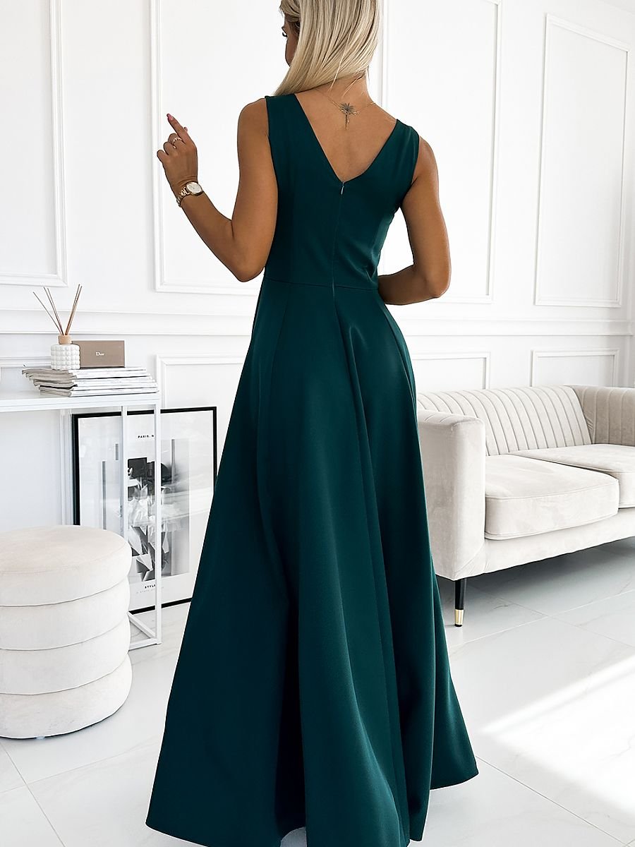 Długa klasyczna suknia z dekoltem. Uszyta z przyjemnego w dotyku materiału w modnym zielonym kolorze. Zapinana z tyłu na kryty zamek. Produkt polski. Marka numoco.