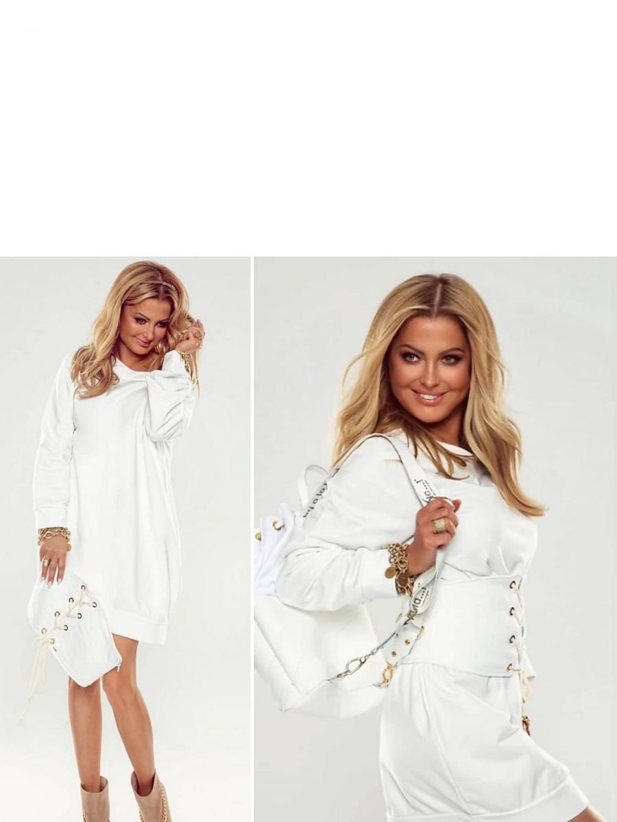 Biała sukienka dresowa z szerokim pasem. Wykonana z miękkiej tkaniny dresowej swobodna w kroju sukienka z kolekcji By o la la. Model z szeroki dekoltem typu łódka i z długimi rękawami zakończonymi mankietami. W komplecie z sukienka dołączony jest efektowny, szeroki, sznurowany pasek zapinany na zamek i haftkę. Dzięki paskowi sukienka zyskuje niepowtarzalny charakter.