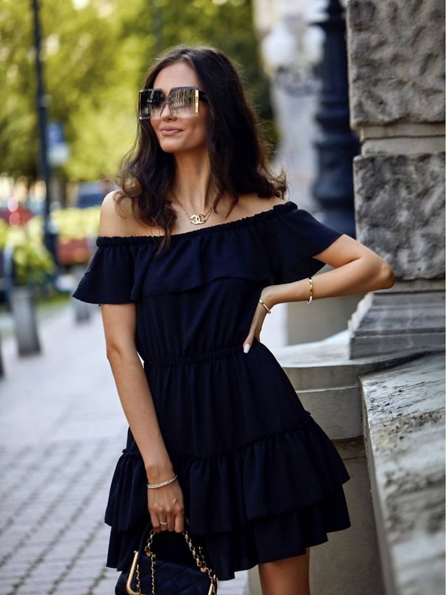 Krótka sukienka z odkrytymi ramionami i falbanami wykonana jest z gładkiej tkaniny, która jest delikatna i przyjemna w dotyku, dzięki czemu będzie ona wygodna w użytkowaniu. Mini sukienka posiada gumkę przy dekolcie, która hamuje spadanie z ramion oraz w talii, którą pięknie podkreśla. Doszyta falbana nadaje lekkości a falbanki na dole sukienki dodają jej dziewczęcego uroku. Sukienka z odkrytymi ramionami będzie idealnym wyborem dla Pań lubiących sportowy styl oraz dla tych, które cenią sobie elegancki wygląd. Dopełnieniem stylizacji będą dobrze dobrane dodatki, ponieważ to dzięki nim hiszpanka będzie elegancka lub sportowa. Jednolite kolory i ich bardzo bogata gama pozwalają na stworzenie wymarzonego wyglądu. Produkt jest wyprodukowany i uszyty w Polsce.