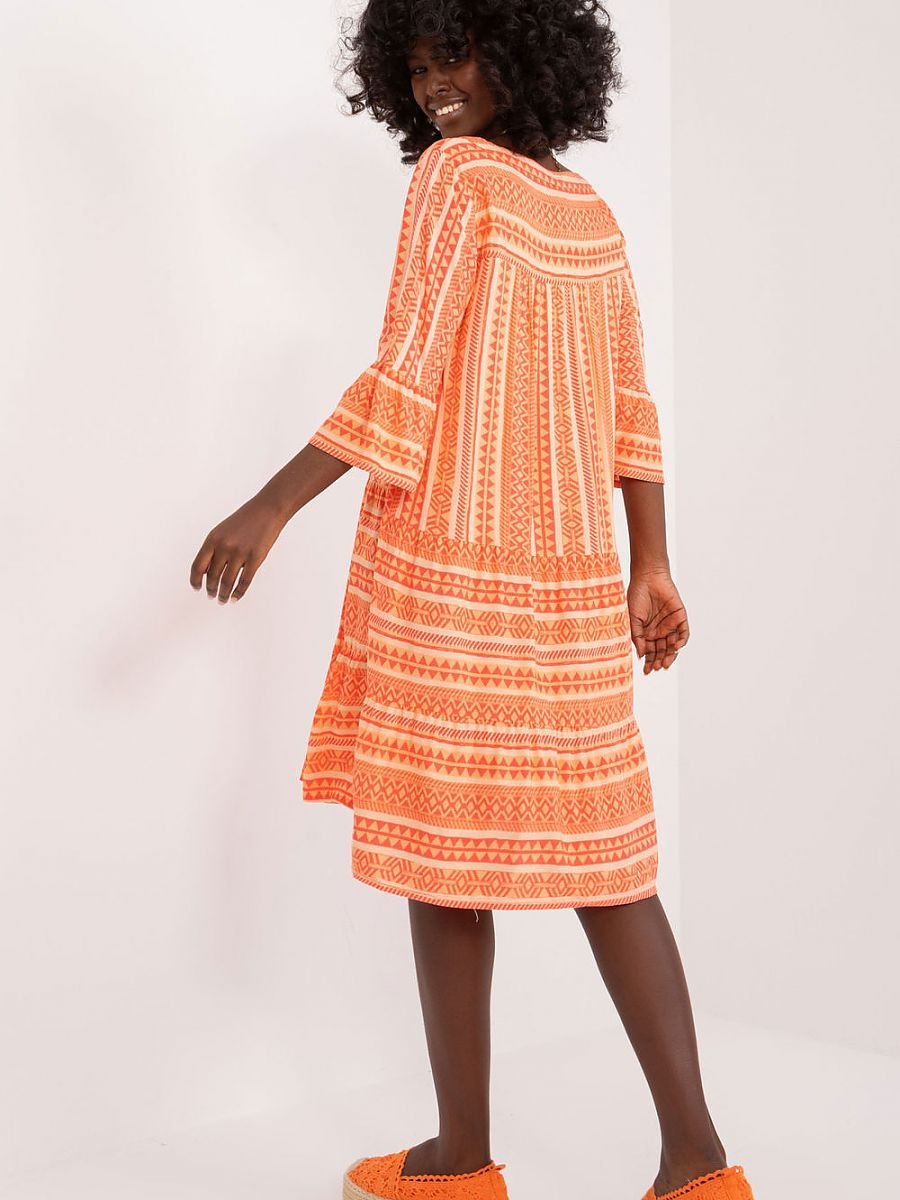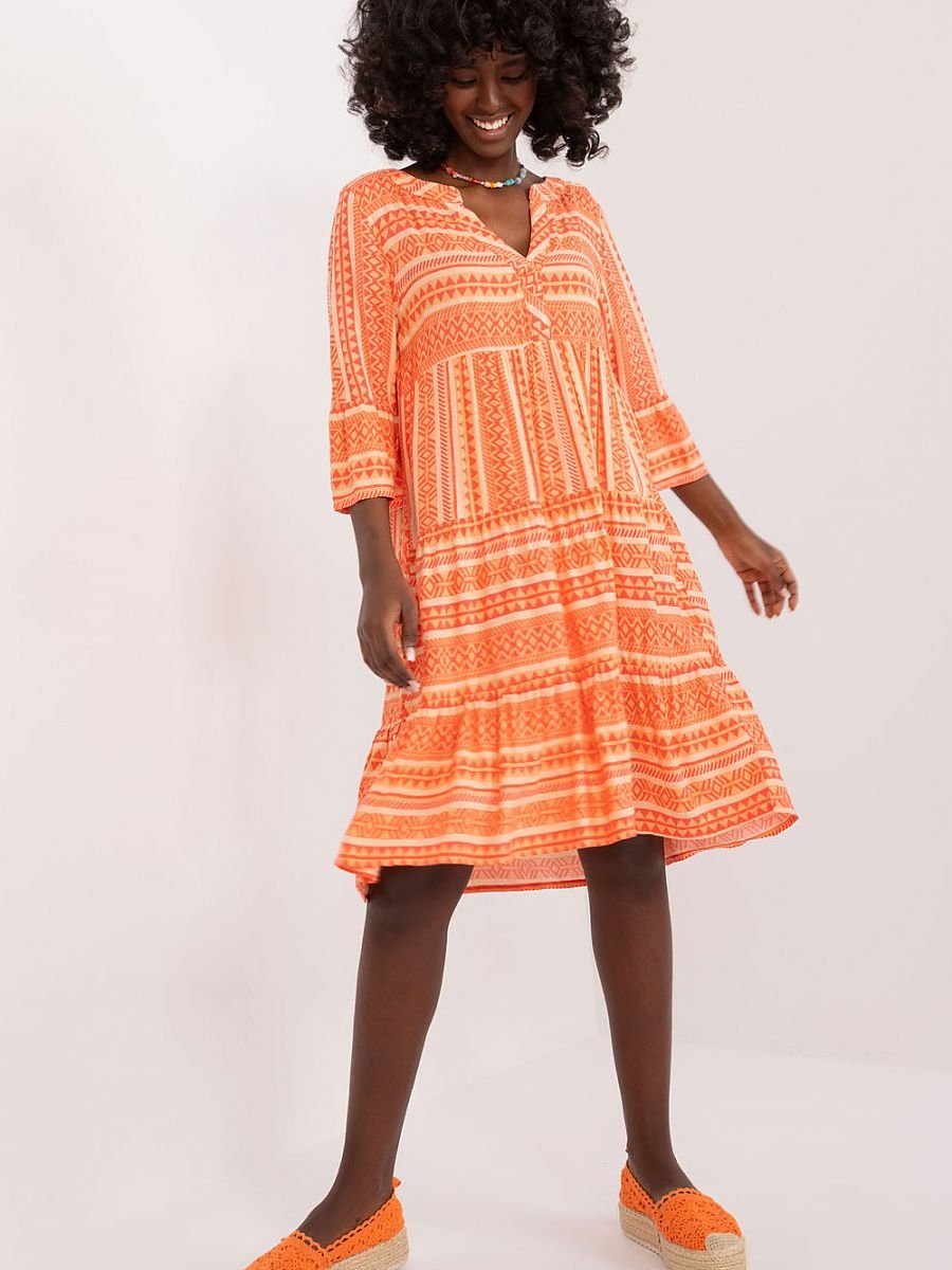 Ta codzienna sukienka to połączenie komfortu i stylu, idealna na różnorodne okazje. Wykonana z lekkiej i przewiewnej wiskozy, jest przyjemna dla skóry, zapewniając wygodę noszenia przez cały dzień. Sukienka posiada fason oversize, który gwarantuje swobodę ruchów i luźny, niezobowiązujący look. Rękawy o długości 3/4 dodają elegancji i są praktyczne zarówno w cieplejsze, jak i chłodniejsze dni. Dekolt w serek nadaje sukience kobiecego charakteru, podkreślając szyję i dekolt. Materiał we wzory sprawia, że sukienka jest wyrazista i przyciąga wzrok, stanowiąc idealny wybór na codzienne wyjścia. Długość przed kolano dodaje lekkości i młodzieńczego uroku, sprawiając, że sukienka wygląda świeżo i modnie. Brak zapięcia zwiększa komfort noszenia, umożliwiając łatwe zakładanie i zdejmowanie. To wszechstronna propozycja dla kobiet ceniących sobie połączenie modnego wyglądu i wygody w codziennych stylizacjach.