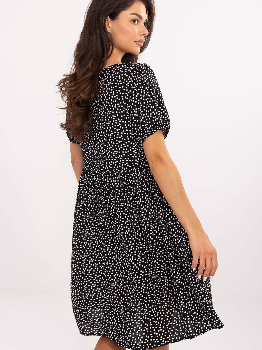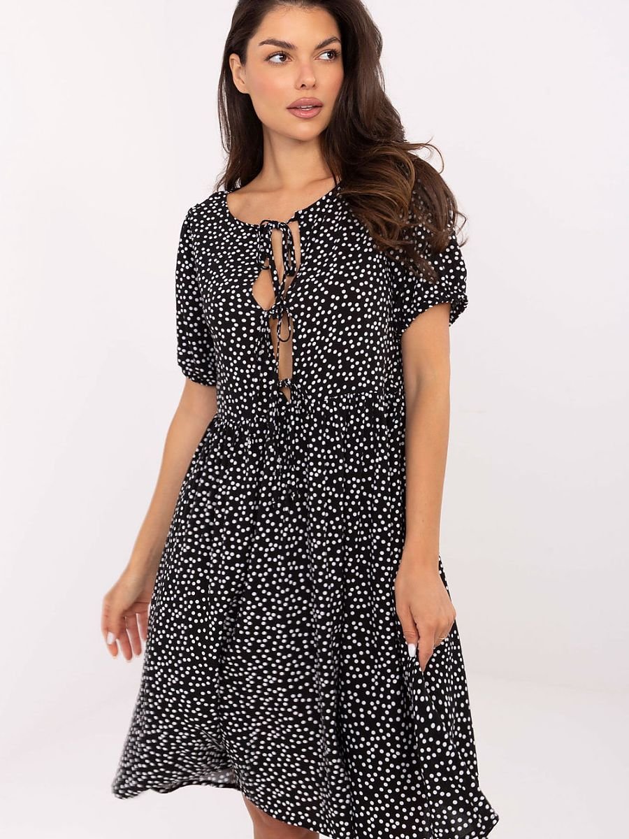 Zwiewna i komfortowa sukienka o rozkloszowanym fasonie, idealna na letnie dni. Wykonana z przyjemnej w dotyku wiskozy, która delikatnie opływa sylwetkę i zapewnia przewiewność. Nadruk na materiale ożywia stylizację i dodaje jej letniego charakteru. Sukienka sięga przed kolano, ma krótki rękaw i klasyczny okrągły dekolt. Zamiast tradycyjnego zapięcia, posiada oryginalne wiązanie z przodu do wysokości pasa, które dodaje uroku. Rozkloszowany dół zapewnia swobodę ruchów i lekkość w noszeniu. To doskonały wybór na codzienne wyjścia na spacer, zakupy czy spotkanie z przyjaciółmi. Stylowa, wygodna i pełna letniego uroku.