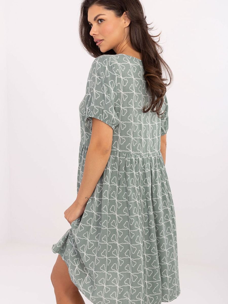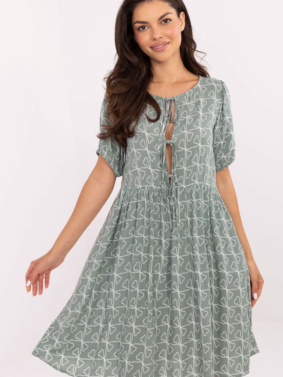 Zwiewna i komfortowa sukienka o rozkloszowanym fasonie, idealna na letnie dni. Wykonana z przyjemnej w dotyku wiskozy, która delikatnie opływa sylwetkę i zapewnia przewiewność. Nadruk na materiale ożywia stylizację i dodaje jej letniego charakteru. Sukienka sięga przed kolano, ma krótki rękaw i klasyczny okrągły dekolt. Zamiast tradycyjnego zapięcia, posiada oryginalne wiązanie z przodu do wysokości pasa, które dodaje uroku. Rozkloszowany dół zapewnia swobodę ruchów i lekkość w noszeniu. To doskonały wybór na codzienne wyjścia na spacer, zakupy czy spotkanie z przyjaciółmi. Stylowa, wygodna i pełna letniego uroku.
