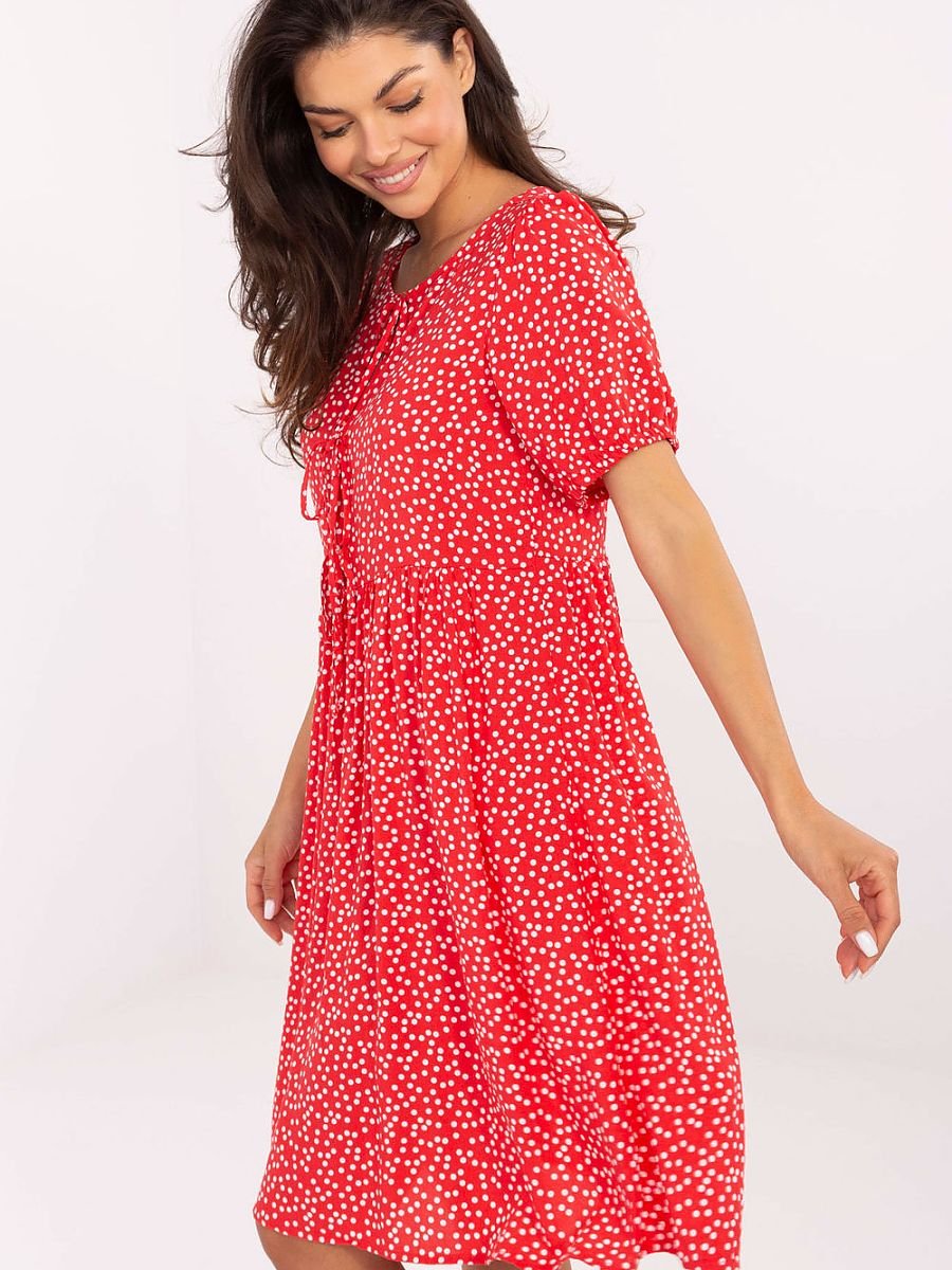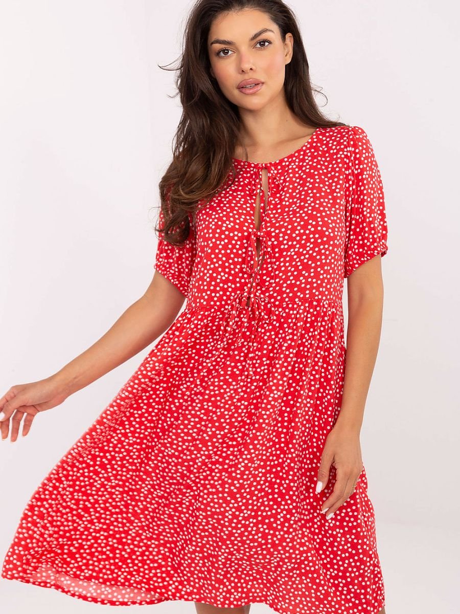 Zwiewna i komfortowa sukienka o rozkloszowanym fasonie, idealna na letnie dni. Wykonana z przyjemnej w dotyku wiskozy, która delikatnie opływa sylwetkę i zapewnia przewiewność. Nadruk na materiale ożywia stylizację i dodaje jej letniego charakteru. Sukienka sięga przed kolano, ma krótki rękaw i klasyczny okrągły dekolt. Zamiast tradycyjnego zapięcia, posiada oryginalne wiązanie z przodu do wysokości pasa, które dodaje uroku. Rozkloszowany dół zapewnia swobodę ruchów i lekkość w noszeniu. To doskonały wybór na codzienne wyjścia na spacer, zakupy czy spotkanie z przyjaciółmi. Stylowa, wygodna i pełna letniego uroku.
