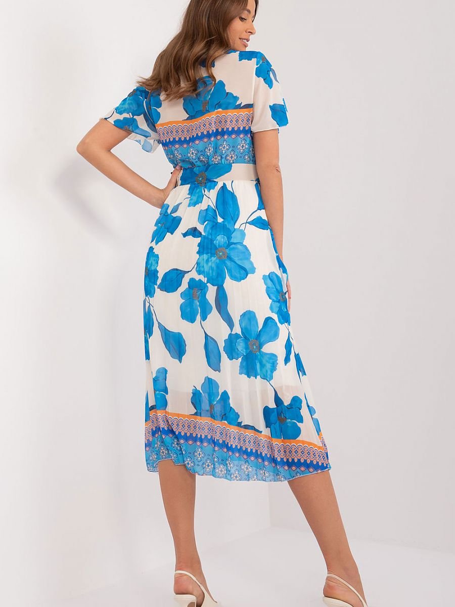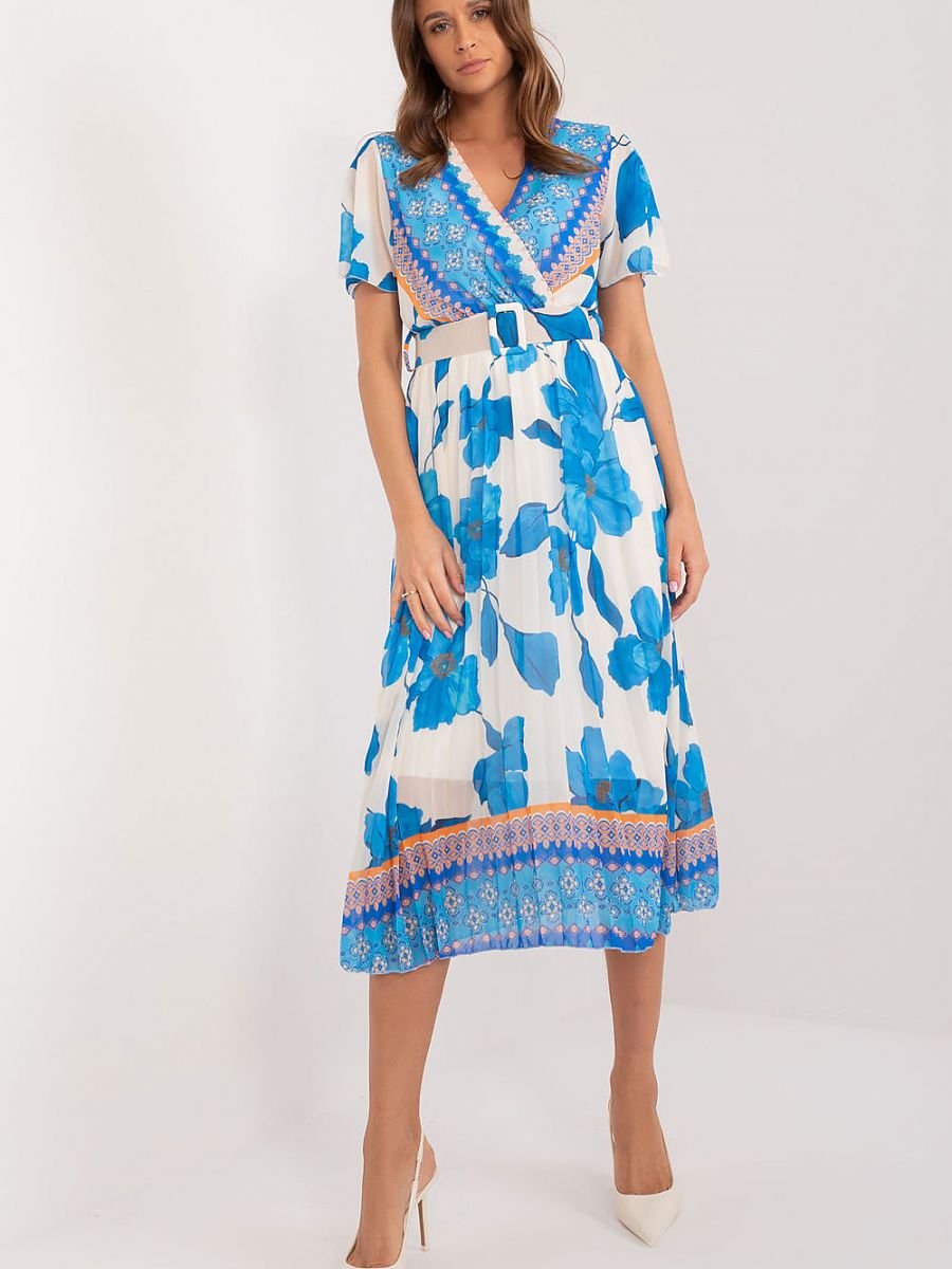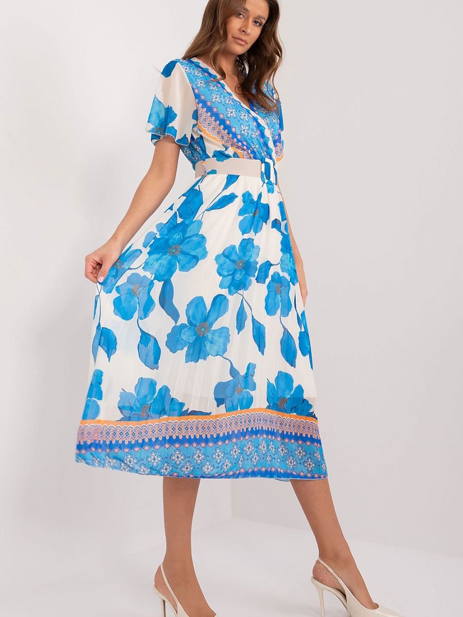 Letnia sukienka z krótkim rękawkiem w formie falbanek. Sukienka z podszewką. Dekolt kopertowy, w pasie zapinany pasek, dół plisowany. Idealna propozycja na wiele okazji.