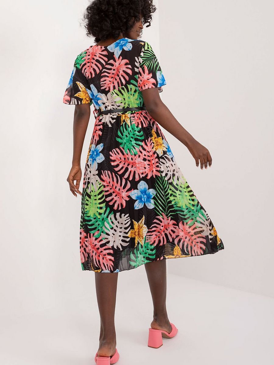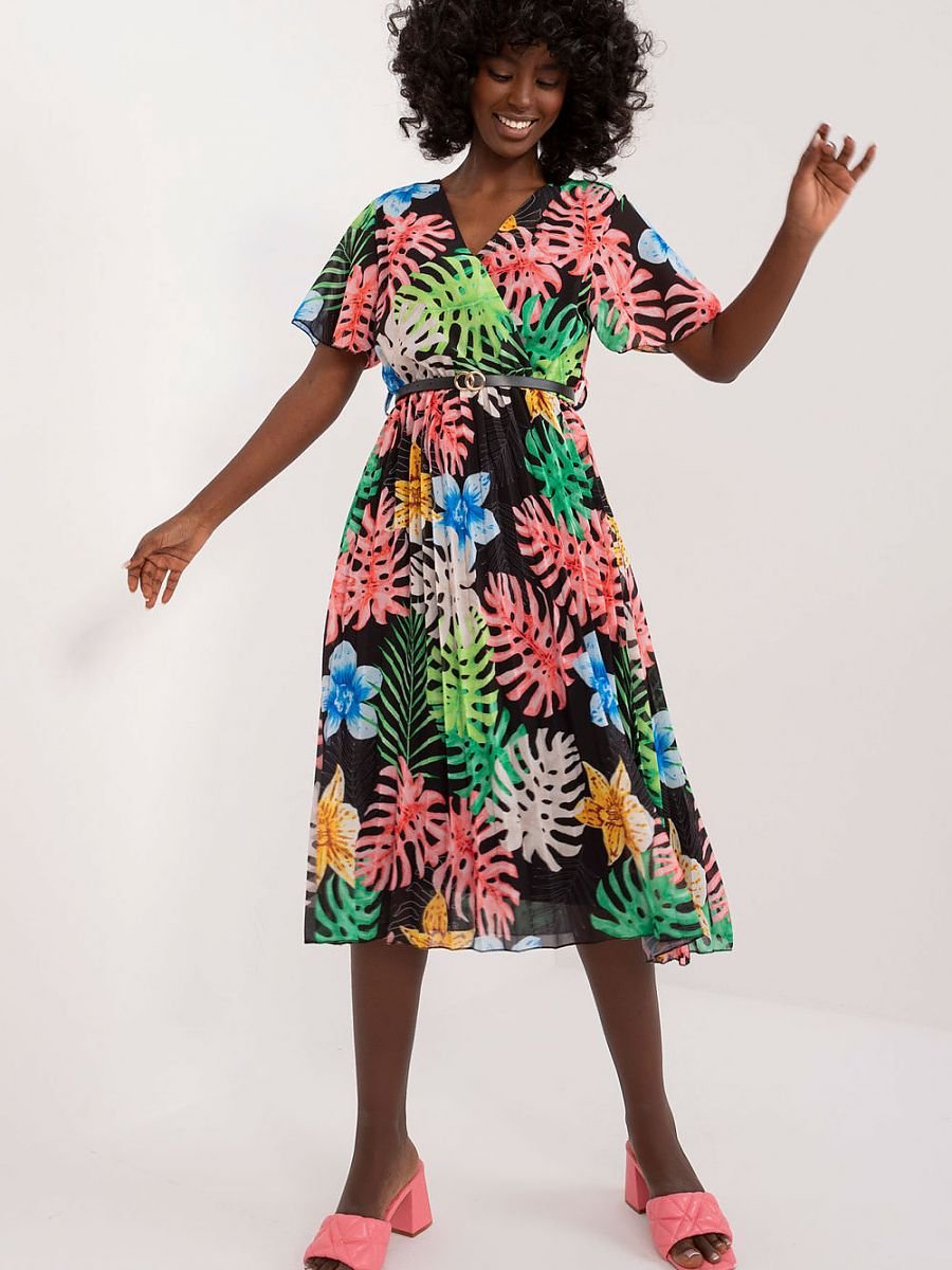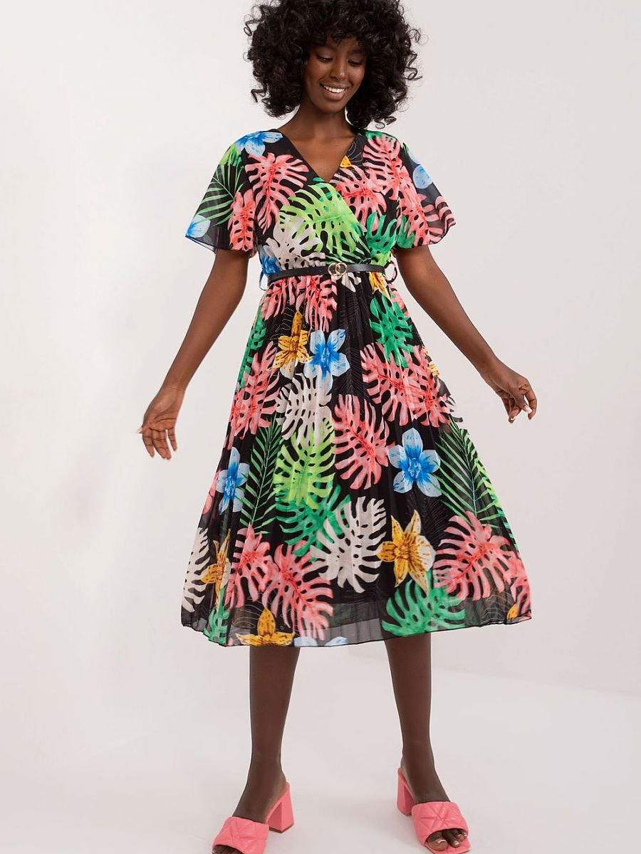 Ta sukienka to kwintesencja codziennej elegancji, która sprawi, że każdy dzień będzie wyjątkowy. Jej rozkloszowany fason zapewnia swobodę ruchów, a zarazem podkreśla kobiecą sylwetkę. Dolna część sukienki ozdobiona jest plisami, dodając lekkości i delikatności całej stylizacji. Wykonana z poliestru, ta sukienka nie tylko prezentuje się świetnie, ale również jest łatwa w pielęgnacji i przyjemna w noszeniu. Jej długość midi sprawia, że jest odpowiednia na wiele okazji, od spacerów po mieście po spotkania ze znajomymi. Krótki rękaw zapewnia komfort noszenia nawet w cieplejsze dni, podczas gdy dekolt kopertowy dodaje sukience subtelnego uroku i kobiecego wyrazu. Sukienka wyposażona jest w zapinany pasek, który podkreśla talię i nadaje sylwetce proporcje. Z podszewką zapewniającą dodatkowy komfort noszenia, ta sukienka to połączenie stylu, wygody i elegancji, które sprawi, że będziesz czuła się pewnie i pięknie każdego dnia. Idealna na codzienne wyjścia, ta sukienka stanie się szybko ulubionym elementem Twojej garderoby.