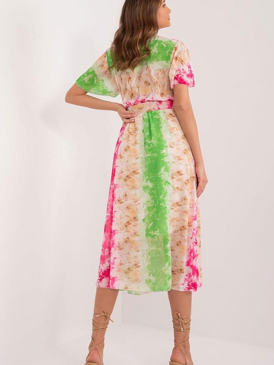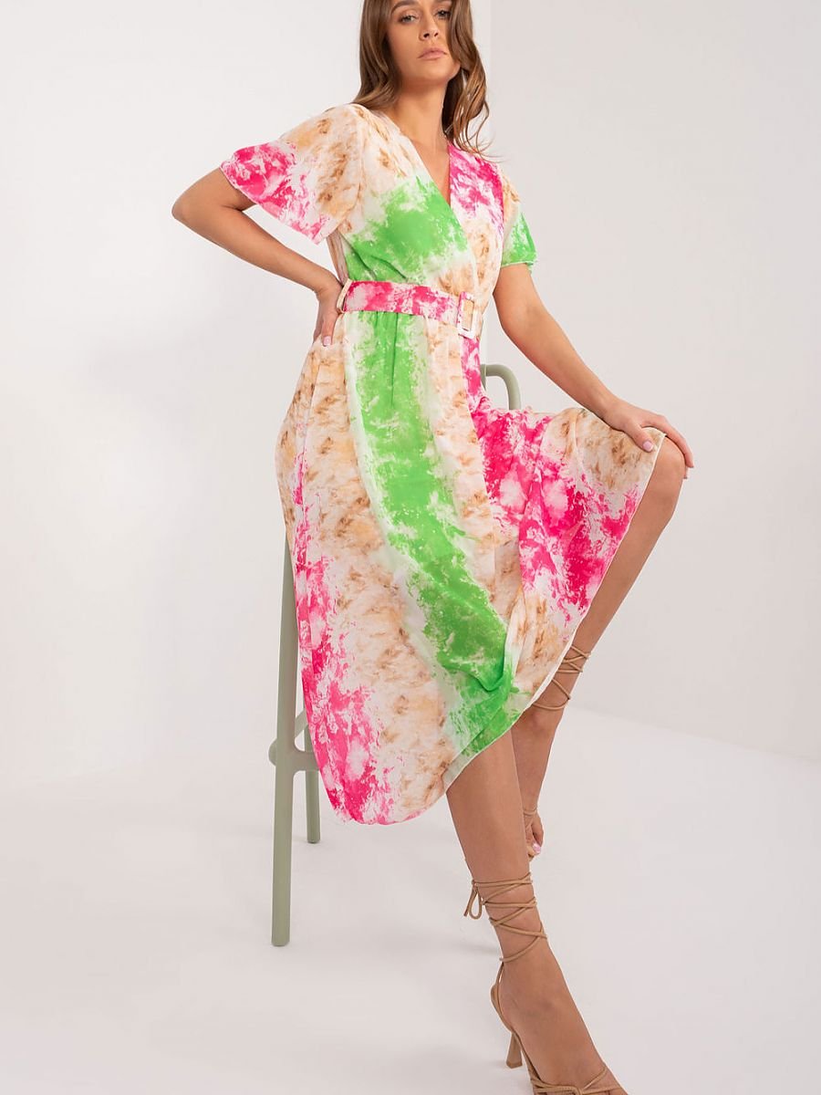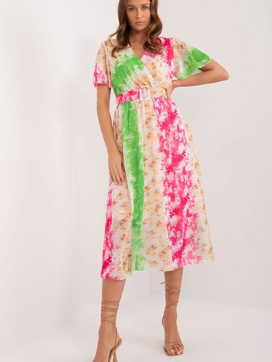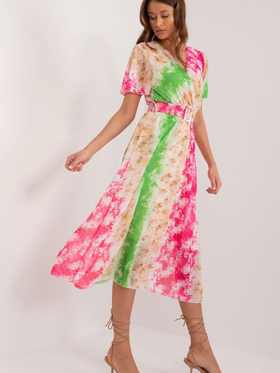 Ta sukienka to idealny wybór na codzienne stylizacje, łączący wygodę z wyrazistym stylem. Wykonana z materiału ozdobionego kolorowym nadrukiem, dodaje świeżości i energii każdemu zestawowi. Krótki rękaw zapewnia swobodę ruchu, a długość midi nadaje sukience uniwersalny charakter, idealnie nadający się na różne okazje. Jako sukienka codzienna, została zaprojektowana z myślą o komforcie i funkcjonalności. Wyposażona w pasek zapinany na klamerkę, który podkreśla talię, nadając sylwetce kobiecy kształt. Dodatkowo, sukienka posiada podszewkę, co zapewnia dodatkowy komfort noszenia oraz lepsze dopasowanie do ciała. Jej prosty fason sprawia, że jest łatwa w stylizacji, pasując zarówno do codziennych, jak i bardziej formalnych okazji. Idealna na spotkania z przyjaciółmi, zakupy czy spacer, ta sukienka sprawi, że każdy dzień będzie pełen stylu i pewności siebie.