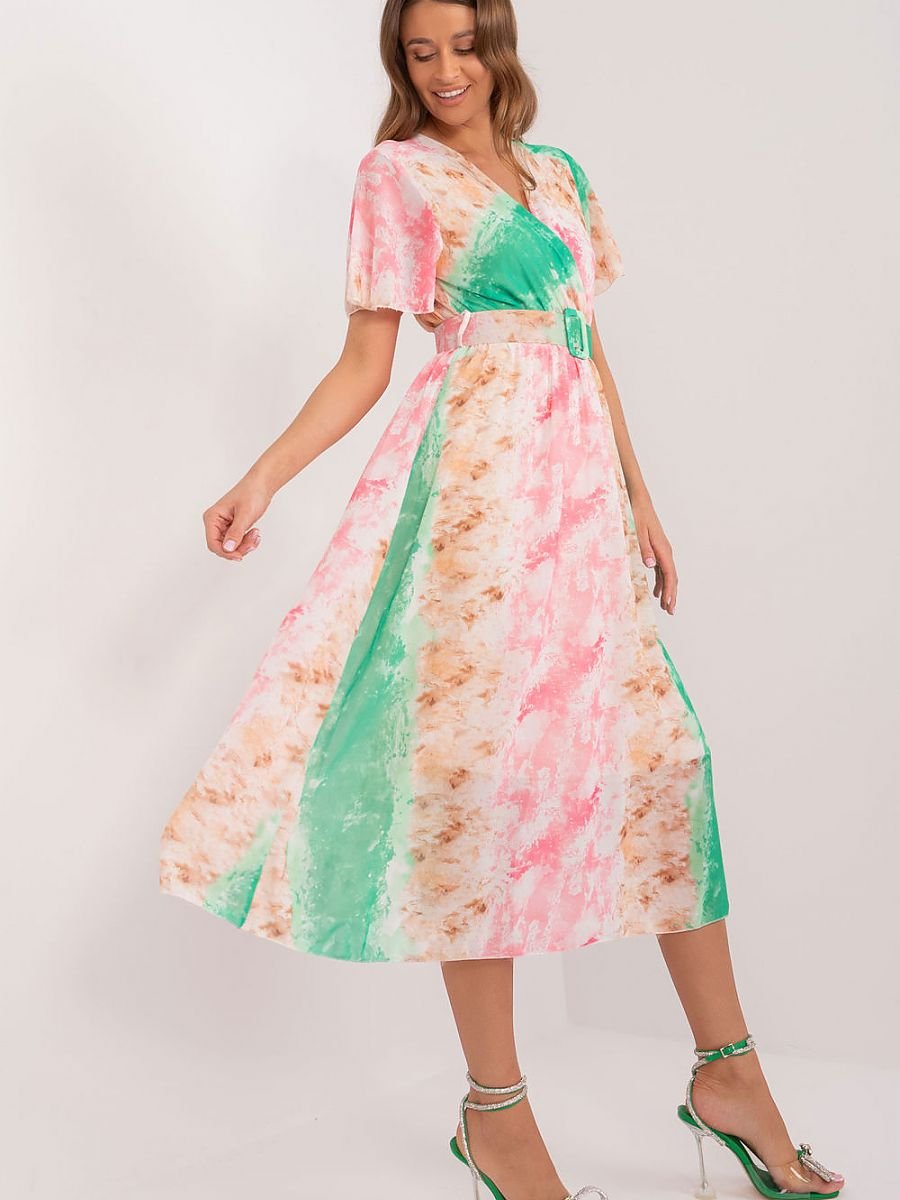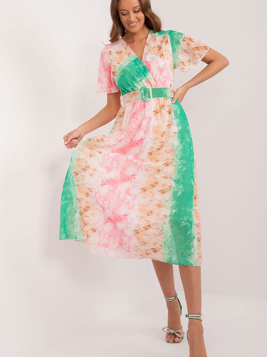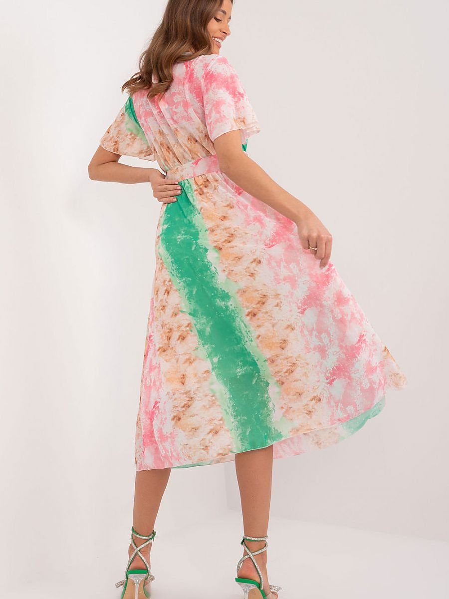 Ta sukienka to idealny wybór na codzienne stylizacje, łączący wygodę z wyrazistym stylem. Wykonana z materiału ozdobionego kolorowym nadrukiem, dodaje świeżości i energii każdemu zestawowi. Krótki rękaw zapewnia swobodę ruchu, a długość midi nadaje sukience uniwersalny charakter, idealnie nadający się na różne okazje. Jako sukienka codzienna, została zaprojektowana z myślą o komforcie i funkcjonalności. Wyposażona w pasek zapinany na klamerkę, który podkreśla talię, nadając sylwetce kobiecy kształt. Dodatkowo, sukienka posiada podszewkę, co zapewnia dodatkowy komfort noszenia oraz lepsze dopasowanie do ciała. Jej prosty fason sprawia, że jest łatwa w stylizacji, pasując zarówno do codziennych, jak i bardziej formalnych okazji. Idealna na spotkania z przyjaciółmi, zakupy czy spacer, ta sukienka sprawi, że każdy dzień będzie pełen stylu i pewności siebie.