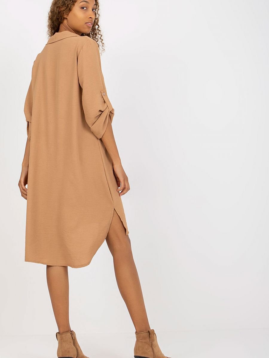 Sukienka koszulowa o luźnym kroju, z długim rękawem oraz dekoltem w serek. Rękawy z możliwością podpięcia. Propozycja idealna na co dzień i nie tylko.