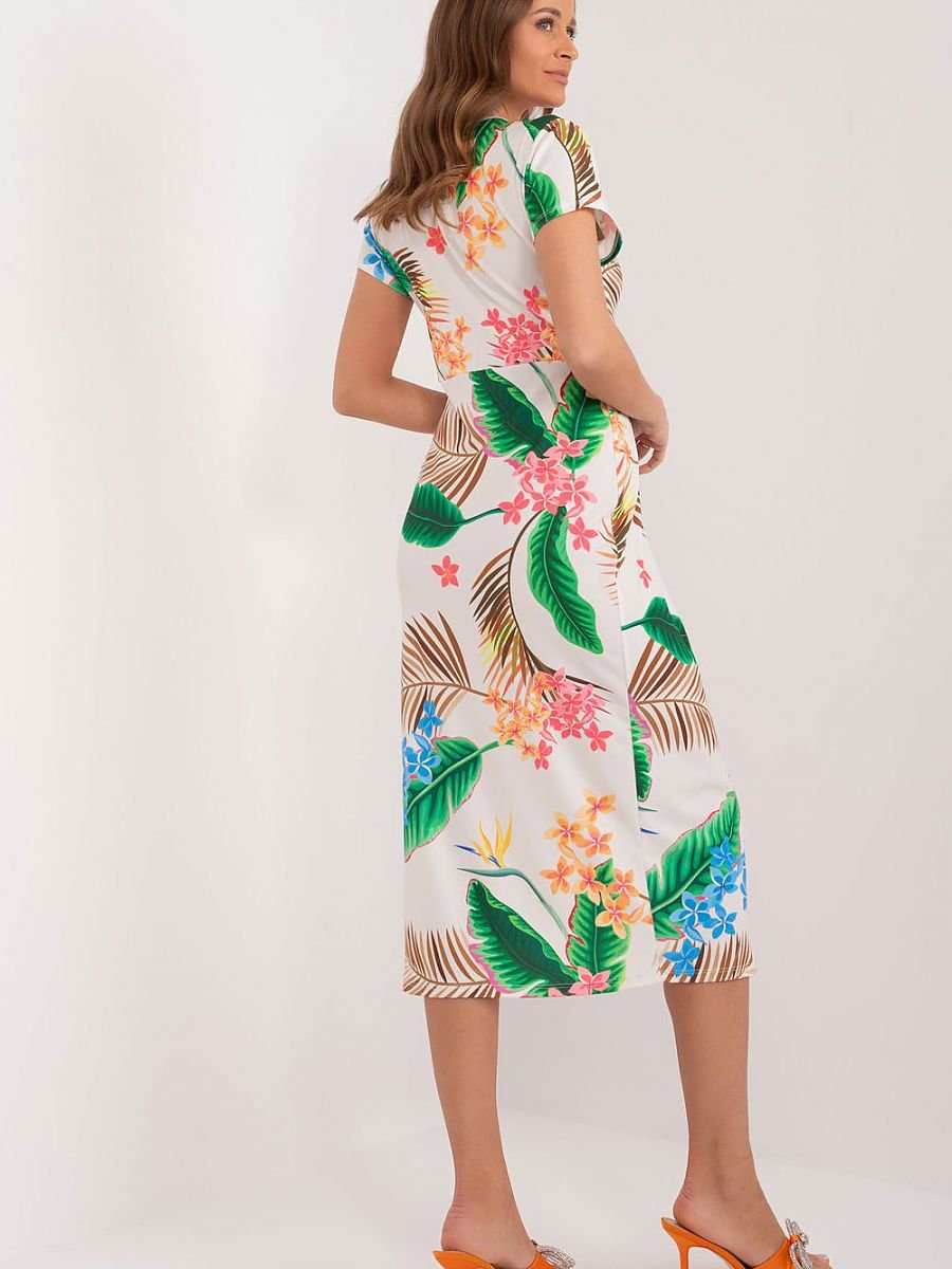 Ta sukienka to połączenie wyrazistego wzoru z eleganckim krojem, idealne na codzienne stylizacje pełne życia. Wykonana z materiału ozdobionego kolorowym nadrukiem, prezentuje się radośnie i energetycznie, dodając uroku każdej stylizacji. Jej przód ozdobiony jest efektownym marszczeniem, które nadaje jej subtelności i kobiecego uroku, jednocześnie maskując ewentualne niedoskonałości. Krótki rękaw oraz dekolt w serek podkreślają delikatność sylwetki, dodając sukience elegancji i subtelności. Długość midi nadaje jej uniwersalny charakter, idealnie nadając się na różne okazje. Sukienka ołówkowa to klasyka, która zawsze prezentuje się stylowo i elegancko. Jej dopasowany fason podkreśla kobiece kształty, dodając pewności siebie i szyku. Dodatkowo, rozcięcie z przodu u dołu sukienki dodaje jej lekkości i dynamiki. Wykonana głównie z poliestru, sukienka jest łatwa w pielęgnacji i utrzymaniu, jednocześnie zachowując doskonały wygląd przez długi czas. Dzięki temu połączeniu stylu, wygody i funkcjonalności, ta sukienka staje się niezastąpionym elementem garderoby, który sprawi, że każdy dzień będzie pełen pewności siebie i elegancji.