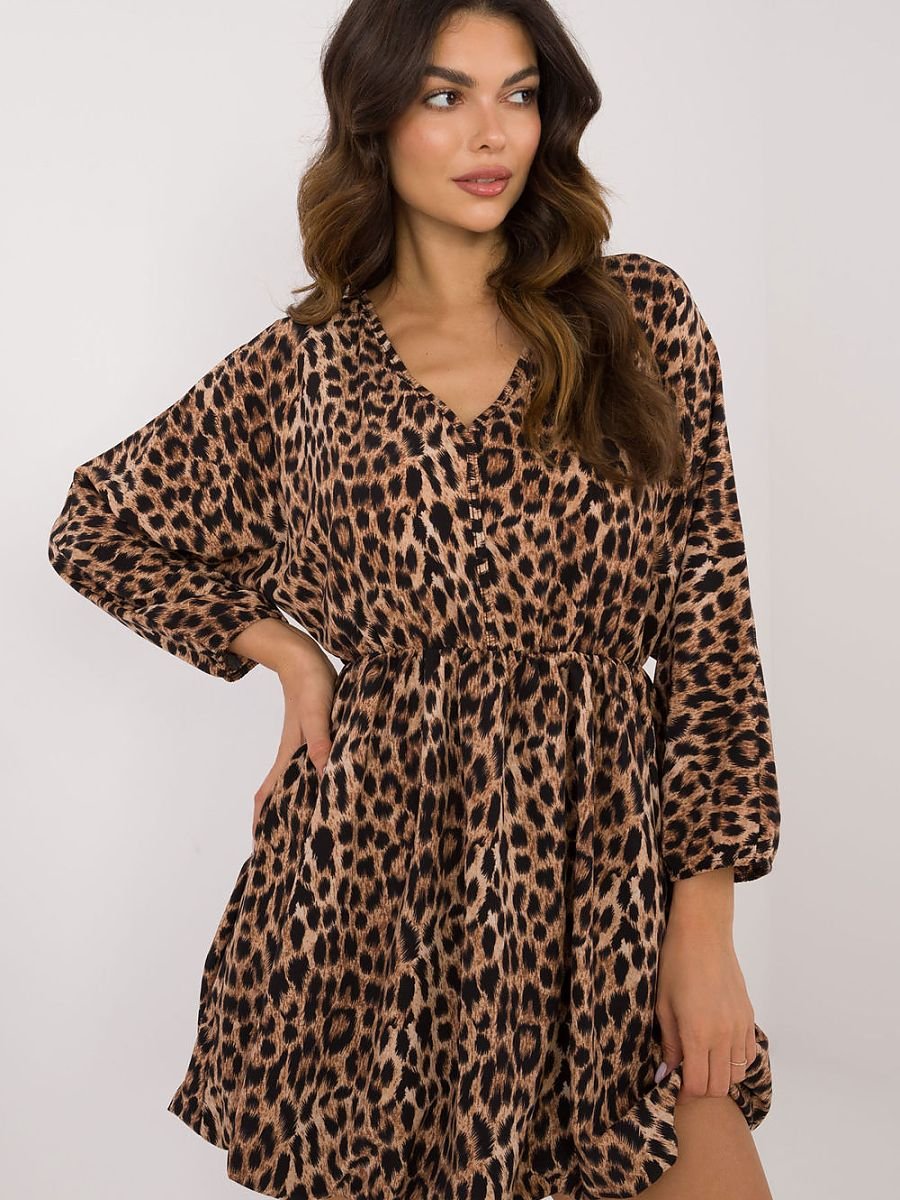 Codzienna rozkloszowana sukienka mini z motywem zwierzęcym, idealna na swobodne, codzienne stylizacje. Wykonana z lekkiego poliestru, zapewnia komfort noszenia, a podszewka dodaje dodatkowej wygody i ochrony. Sukienka ma długi rękaw oraz dekolt w serek, który subtelnie podkreśla linię szyi. Rozkloszowany fason nadaje sylwetce lekkości i wdzięku, tworząc idealny wybór na co dzień.
