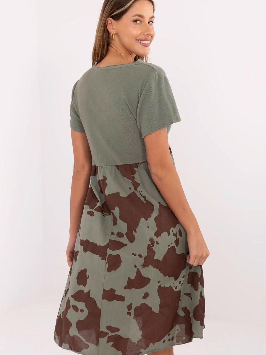 Ta letnia, rozkloszowana sukienka to połączenie wygody, stylu i oryginalnego designu. Wykonana z przewiewnej mieszanki bawełny i elastanu, doskonale sprawdzi się na co dzień, zarówno w mieście, jak i podczas letniego wypoczynku. Górna część sukienki została uszyta z prążkowanego materiału, który subtelnie dopasowuje się do sylwetki, podkreślając jej atuty. Dekolt w serek oraz krótkie rękawy nadają całości lekkości i kobiecego uroku. Dół sukienki zdobi oryginalny motyw zwierzęcy, który dodaje charakteru i przełamuje klasyczną, gładką górę. Model o długości za kolano jest nie tylko stylowy, ale i funkcjonalny, posiada praktyczne kieszenie ukryte w bocznych szwach, które zwiększają komfort noszenia. To sukienka idealna na codzienne wyjścia, łączy w sobie prostotę z odrobiną dzikiego akcentu, tworząc wyjątkową propozycję dla kobiet ceniących wygodę i modny wygląd.