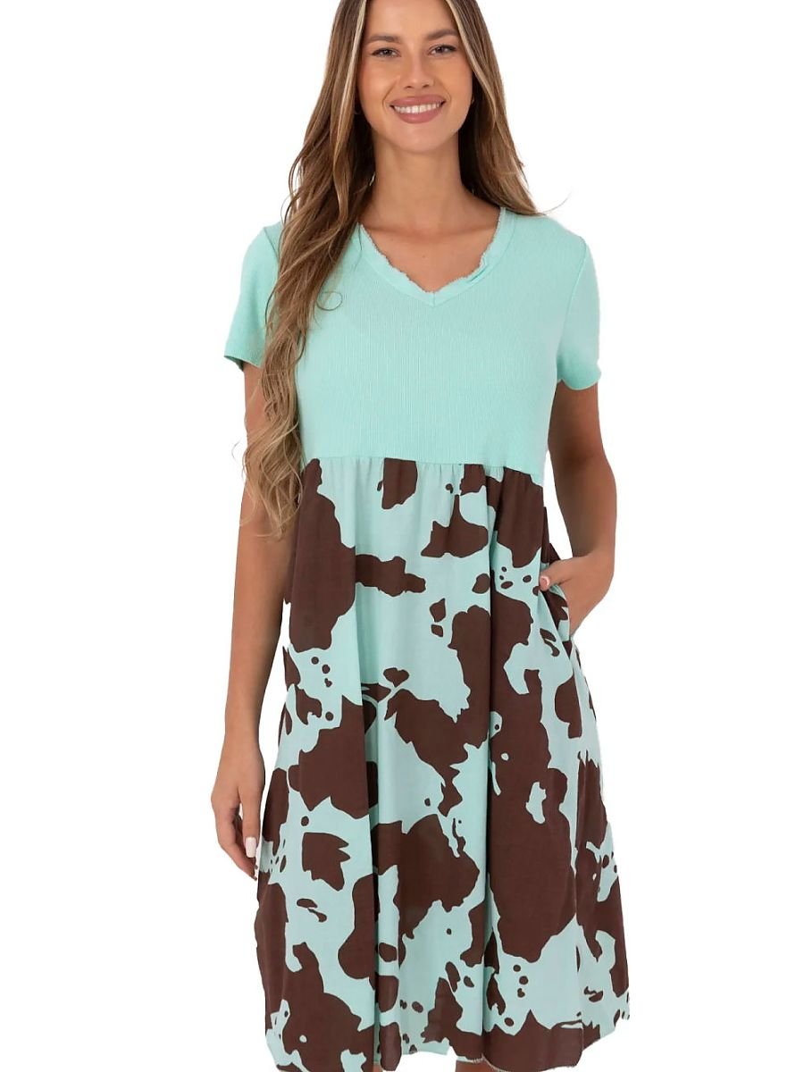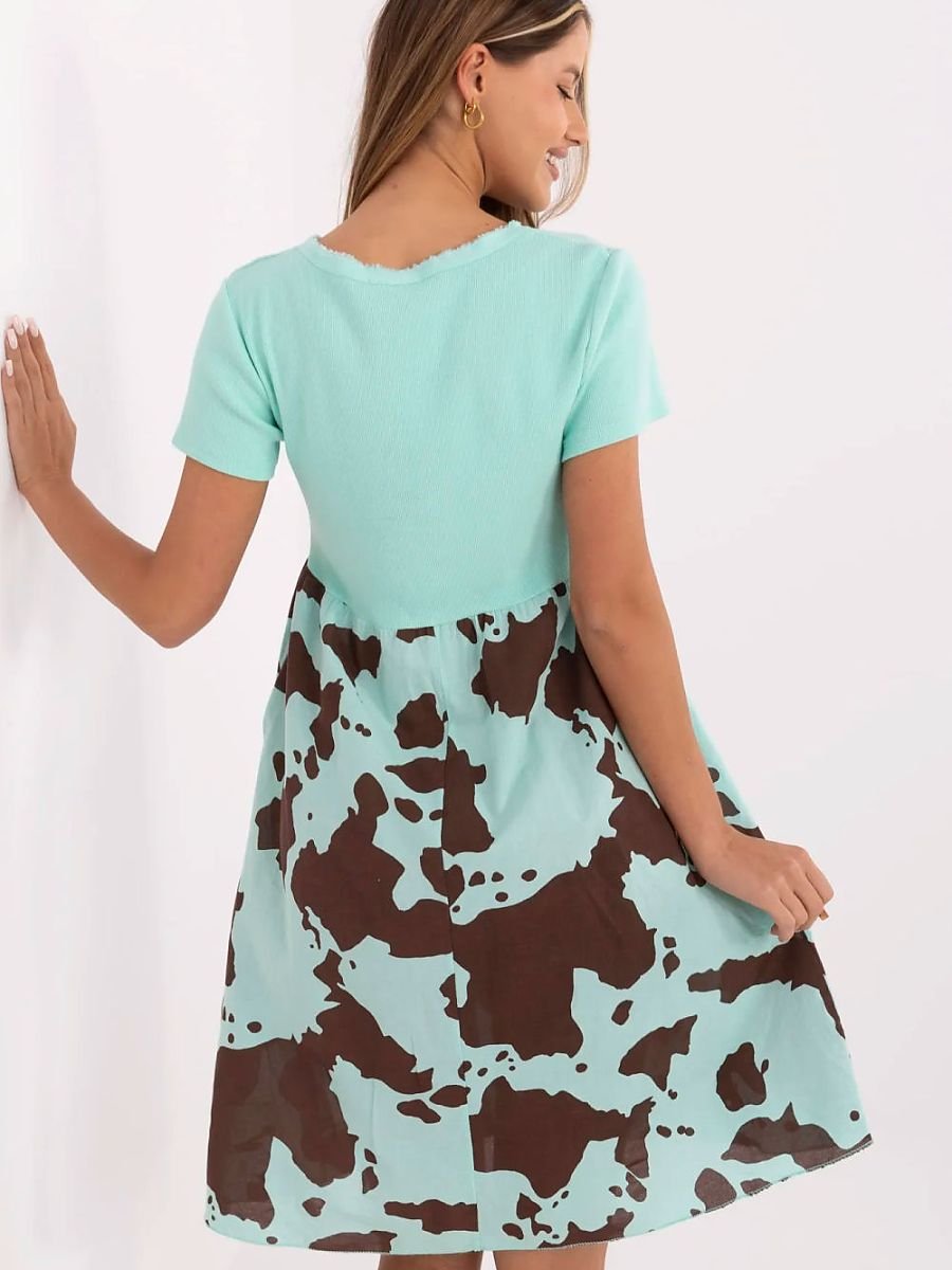 Ta letnia, rozkloszowana sukienka to połączenie wygody, stylu i oryginalnego designu. Wykonana z przewiewnej mieszanki bawełny i elastanu, doskonale sprawdzi się na co dzień, zarówno w mieście, jak i podczas letniego wypoczynku. Górna część sukienki została uszyta z prążkowanego materiału, który subtelnie dopasowuje się do sylwetki, podkreślając jej atuty. Dekolt w serek oraz krótkie rękawy nadają całości lekkości i kobiecego uroku. Dół sukienki zdobi oryginalny motyw zwierzęcy, który dodaje charakteru i przełamuje klasyczną, gładką górę. Model o długości za kolano jest nie tylko stylowy, ale i funkcjonalny, posiada praktyczne kieszenie ukryte w bocznych szwach, które zwiększają komfort noszenia. To sukienka idealna na codzienne wyjścia, łączy w sobie prostotę z odrobiną dzikiego akcentu, tworząc wyjątkową propozycję dla kobiet ceniących wygodę i modny wygląd.