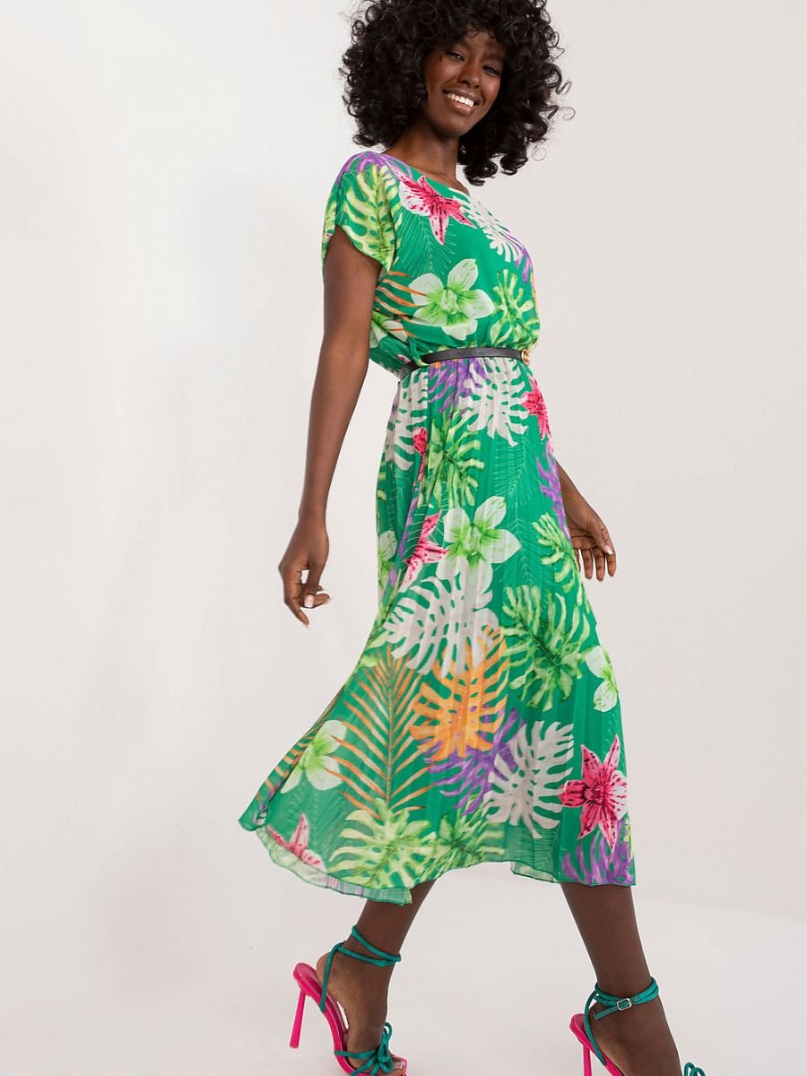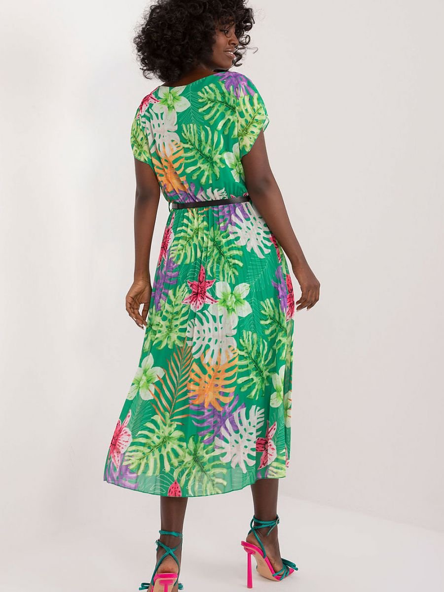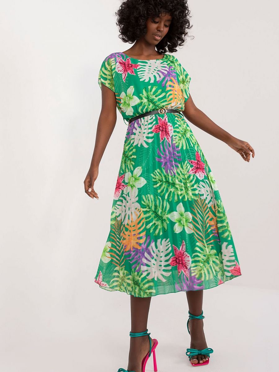 Letnia sukienka z krótkim rękawkiem, okrągły dekolt, dół rozkloszowany. Sukienka z tkaniny w kolorowy wzór na podszewce. Idealna na wiele okazji.