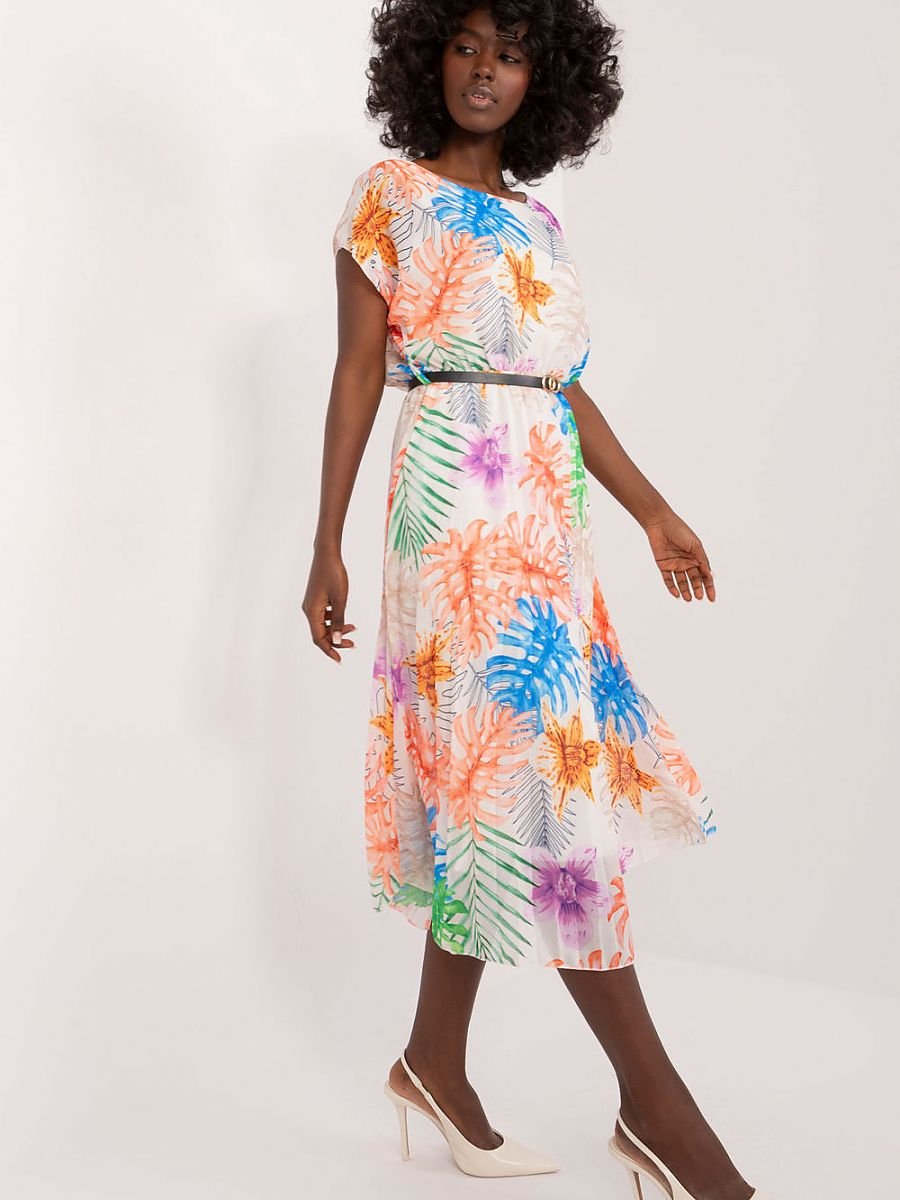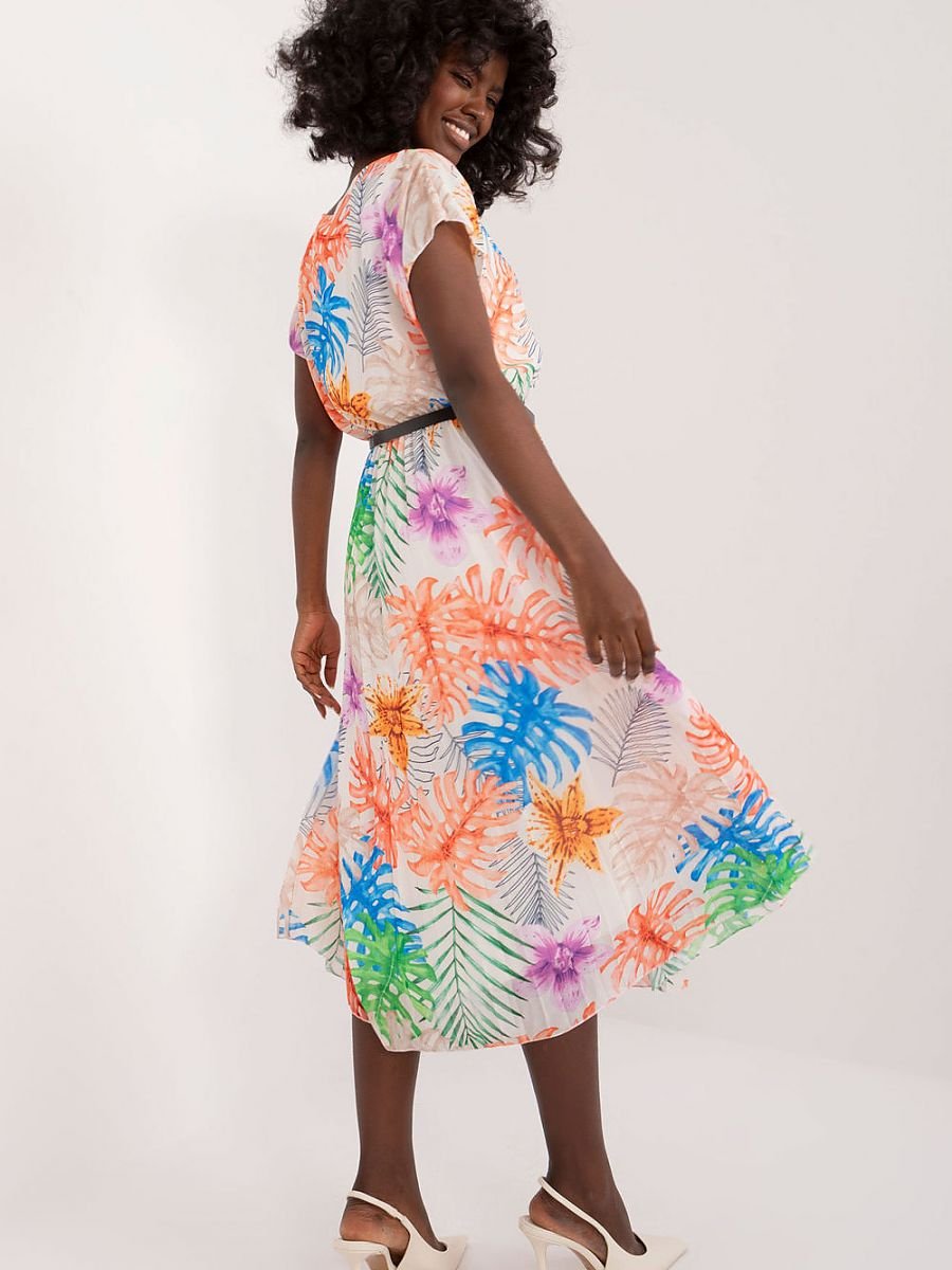 Letnia sukienka z krótkim rękawkiem, okrągły dekolt, dół rozkloszowany. Sukienka z tkaniny w kolorowy wzór na podszewce. Idealna na wiele okazji.