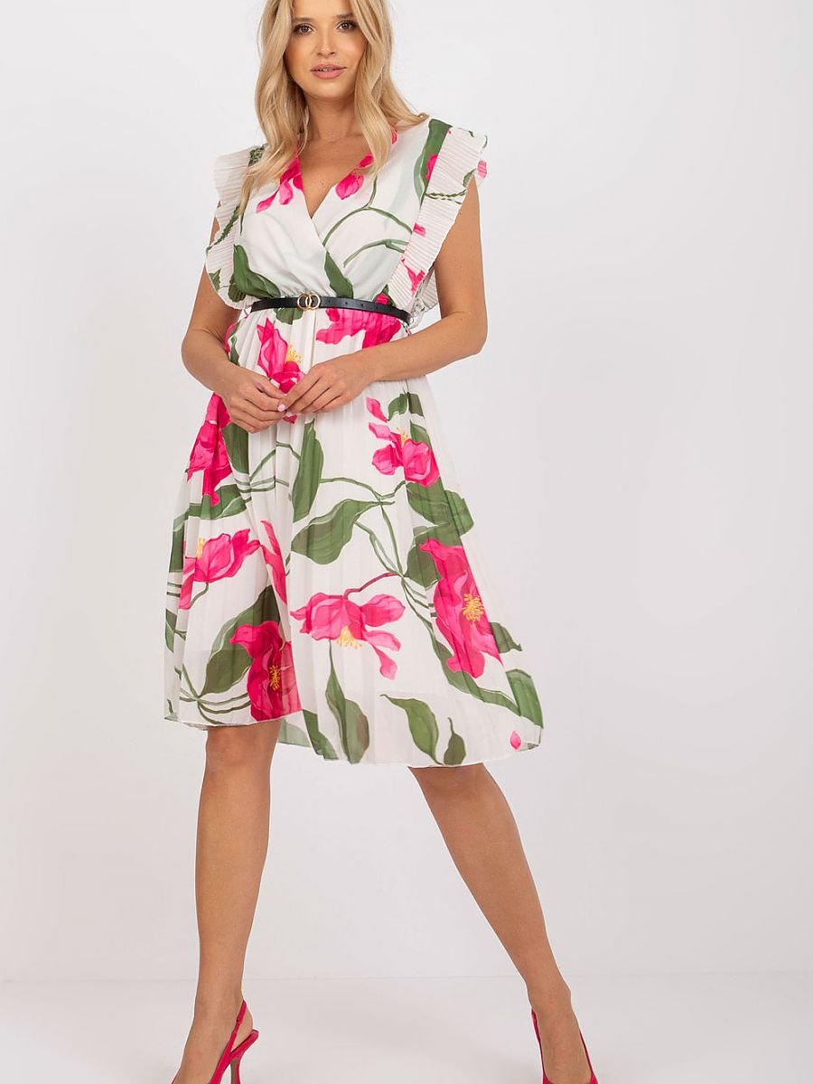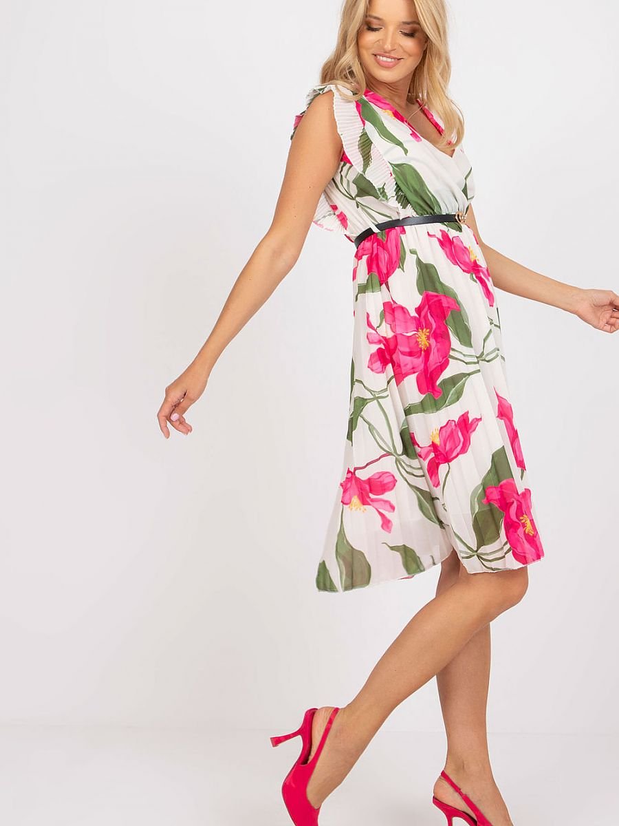 Plisowana sukienka letnia na wiele okazji, z krótkim rękawkiem w formie falbanki. Sukienka posiada podszewkę, gumkę w pasie, dekolt w serek. Sukienkę o rozkloszowanym kroju, dopełnia oprócz falbanek, pasek w talii.