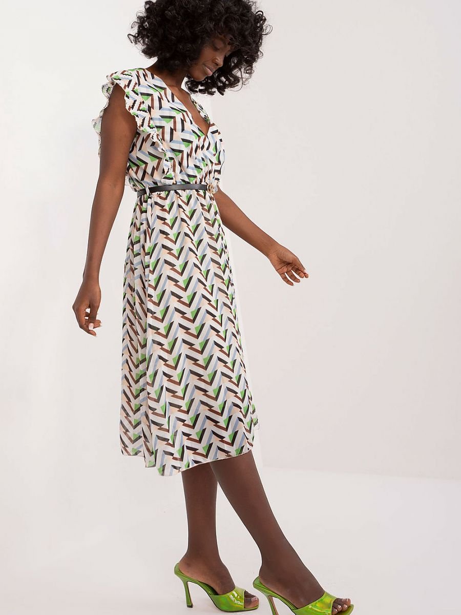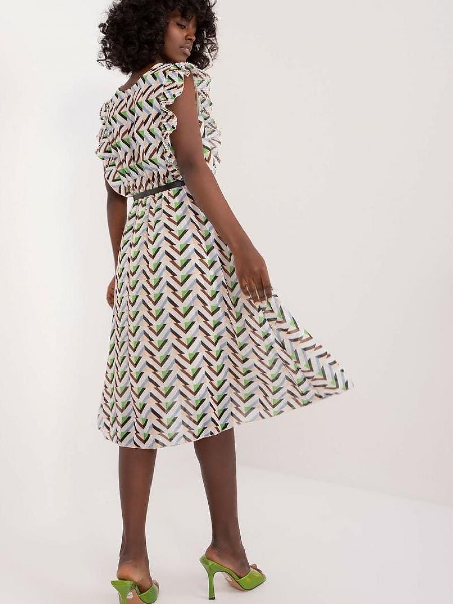 Plisowana sukienka letnia na wiele okazji, z krótkim rękawkiem w formie falbanki. Sukienka posiada podszewkę, gumkę w pasie, dekolt w serek. Sukienkę o rozkloszowanym kroju, dopełnia oprócz falbanek, pasek w talii.
