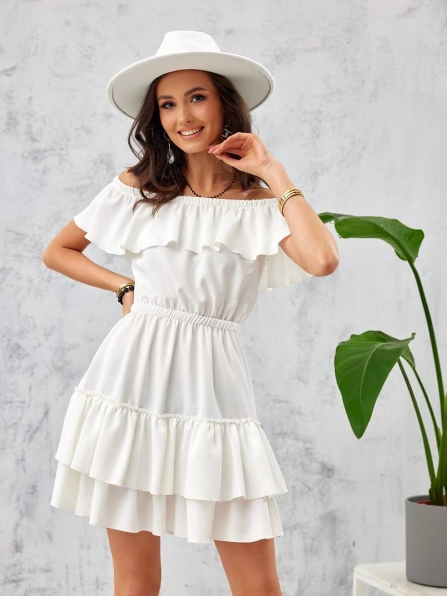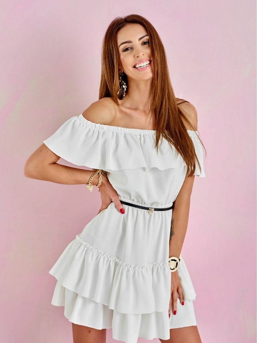 Krótka sukienka z odkrytymi ramionami i falbanami wykonana jest z gładkiej tkaniny, która jest delikatna i przyjemna w dotyku, dzięki czemu będzie ona wygodna w użytkowaniu. Mini sukienka posiada gumkę przy dekolcie, która hamuje spadanie z ramion oraz w talii, którą pięknie podkreśla. Doszyta falbana nadaje lekkości a falbanki na dole sukienki dodają jej dziewczęcego uroku. Sukienka z odkrytymi ramionami będzie idealnym wyborem dla Pań lubiących sportowy styl oraz dla tych, które cenią sobie elegancki wygląd. Dopełnieniem stylizacji będą dobrze dobrane dodatki, ponieważ to dzięki nim hiszpanka będzie elegancka lub sportowa. Jednolite kolory i ich bardzo bogata gama pozwalają na stworzenie wymarzonego wyglądu. Produkt jest wyprodukowany i uszyty w Polsce.
