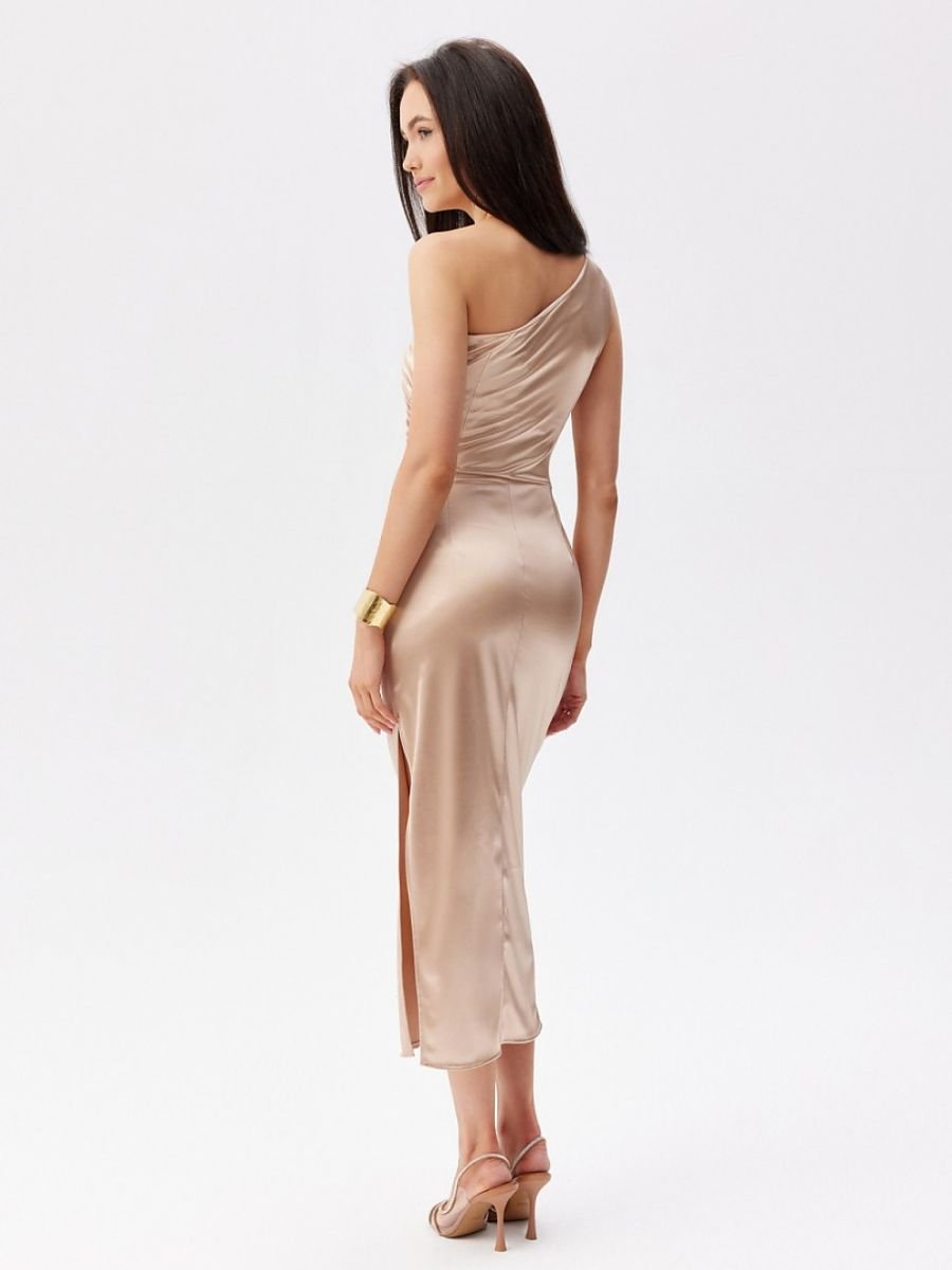 Satynowa sukienka midi z asymetryczną górą na jedno ramię, ozdobiona subtelnym marszczeniem przy ramieniu. Prosty dół urozmaicono efektownym rozcięciem, które odsłania nogę i dodaje lekkości. Model bez podszewki, zapinany z tyłu na ukryty zamek błyskawiczny.