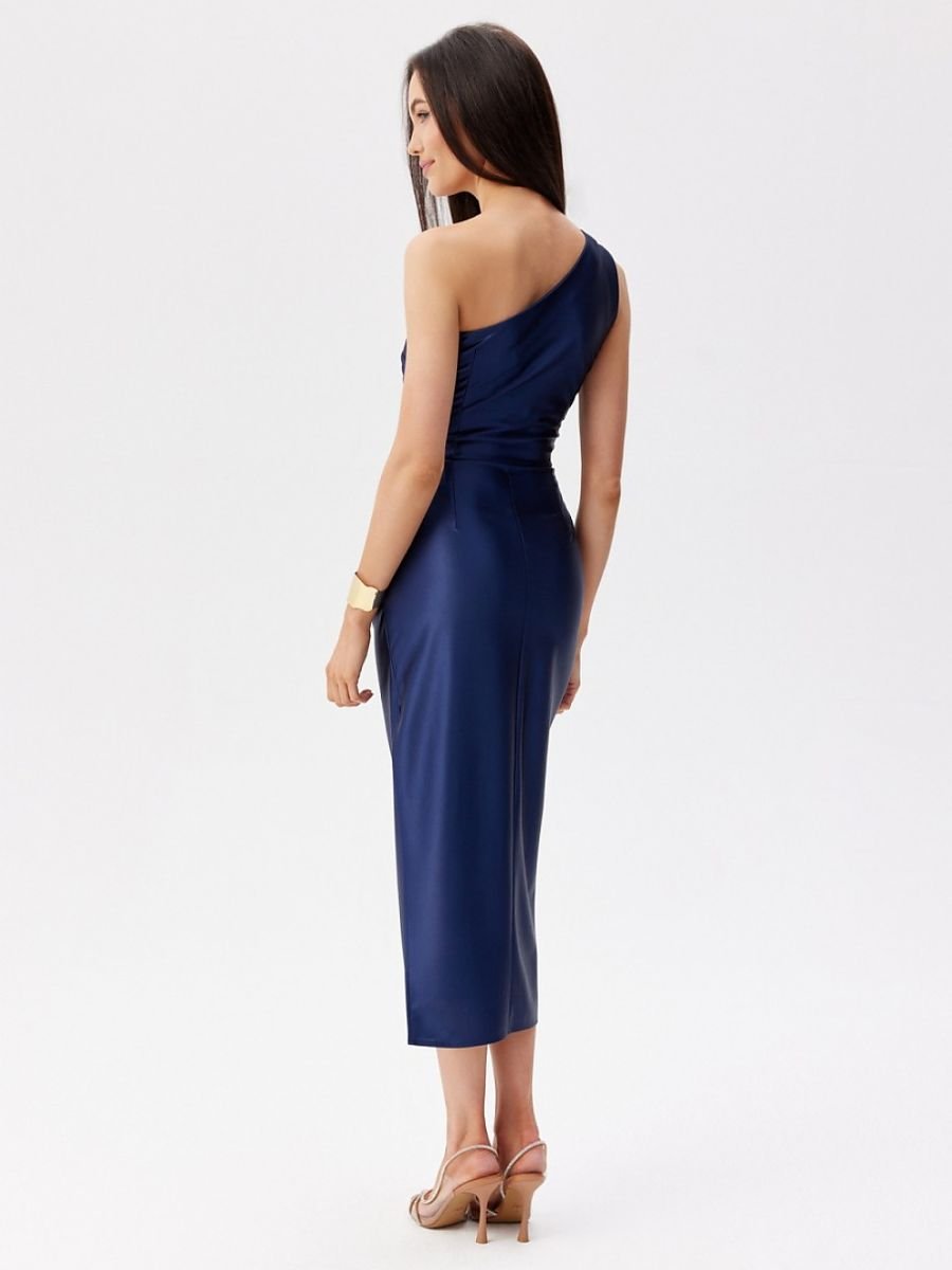 Satynowa sukienka midi z asymetryczną górą na jedno ramię, ozdobiona subtelnym marszczeniem przy ramieniu. Prosty dół urozmaicono efektownym rozcięciem, które odsłania nogę i dodaje lekkości. Model bez podszewki, zapinany z tyłu na ukryty zamek błyskawiczny.