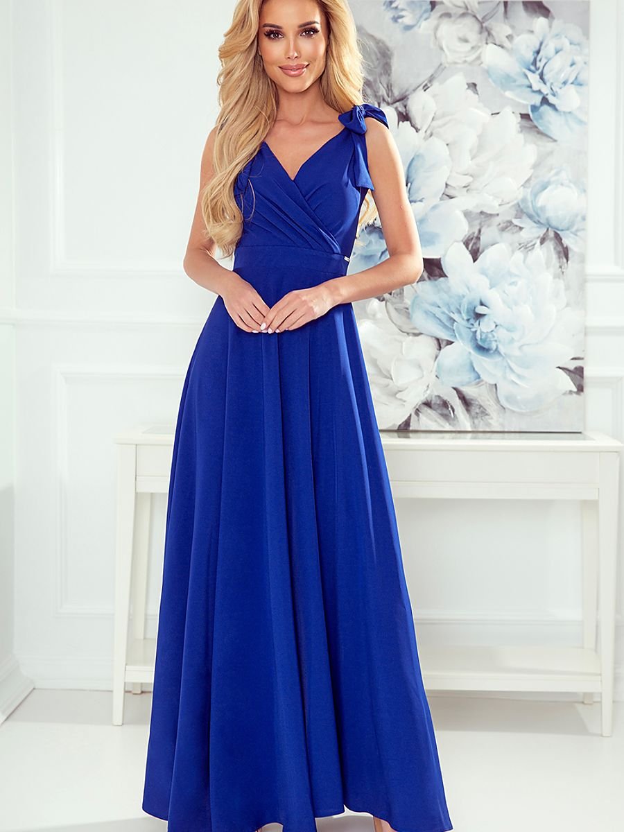 Długa suknia z dekoltem, rozcięciem na nodze i kokardkami na ramionach. Uszyta z przyjemnego w dotyku materiału w modnym chabrowym kolorze. Produkt polski. Marka numoco.