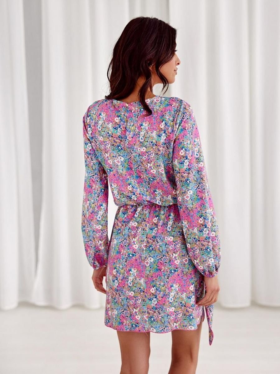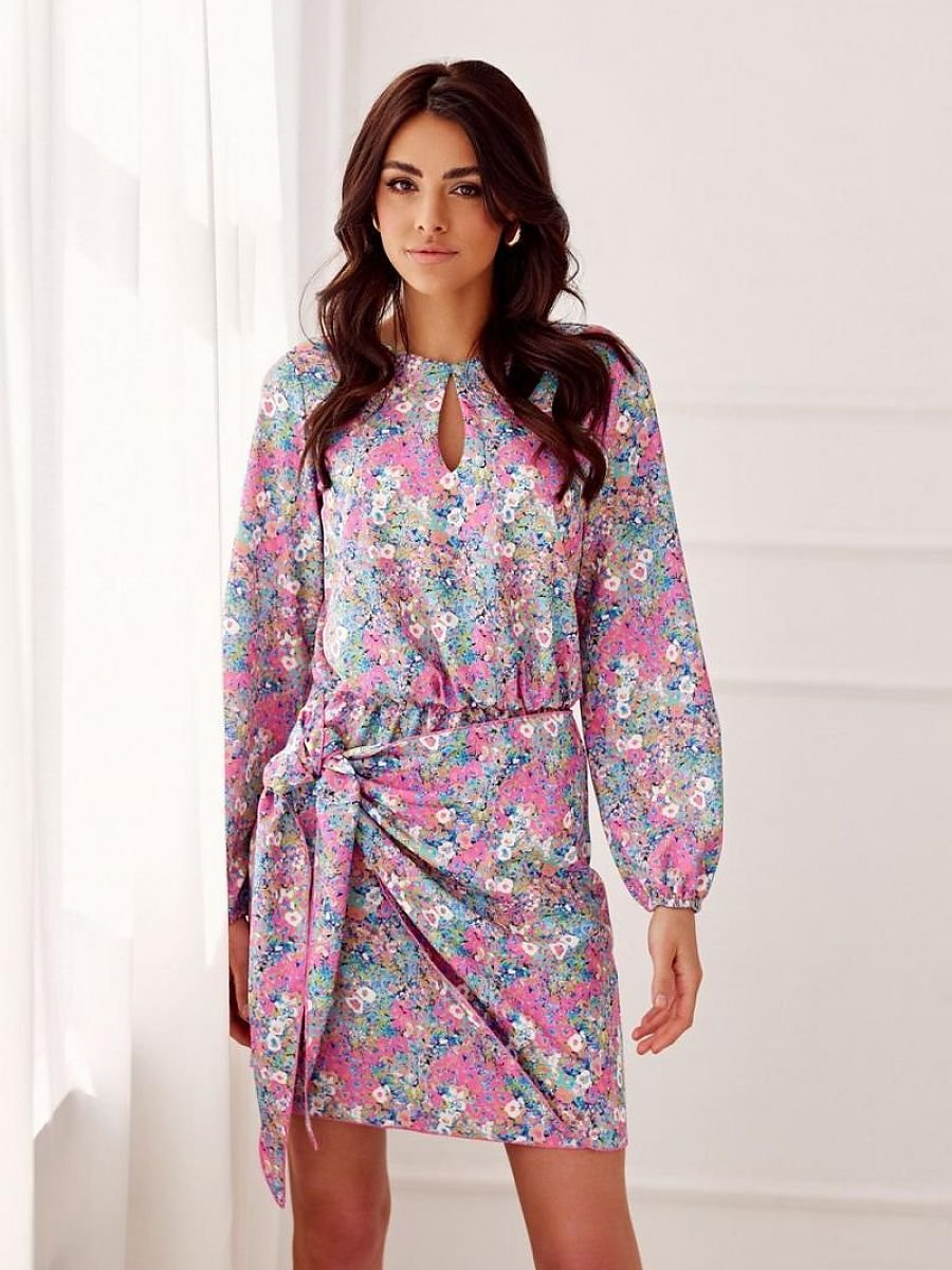 Sukienka mini z wiązaniem z boku i łezką przy dekolcie wykonana jest z pięknej wzorzystej tkaniny, która jest bardzo wygodna w użytkowaniu. Sukienka cechuje się wiązaniem w talii, które dodaje jej uroku. Posiada również zjawiskowe wycięcie przy dekolcie w kształcie łezki oraz długie rękawy zakończone gumką, które sprawdzą się podczas chłodniejszych dni. Łącząc ją z dobrze dobraną biżuterią oraz butami na wysokim obcasie będzie wyglądać elegancko. Natomiast w połączeniu z płaskimi butami stworzy nam codzienny look. To od ciebie zależy jaki outfit wybierzesz. Krótka sukienka będzie idealna na różnego typu okazje takie jak: wesele, komunia, chrzciny.
