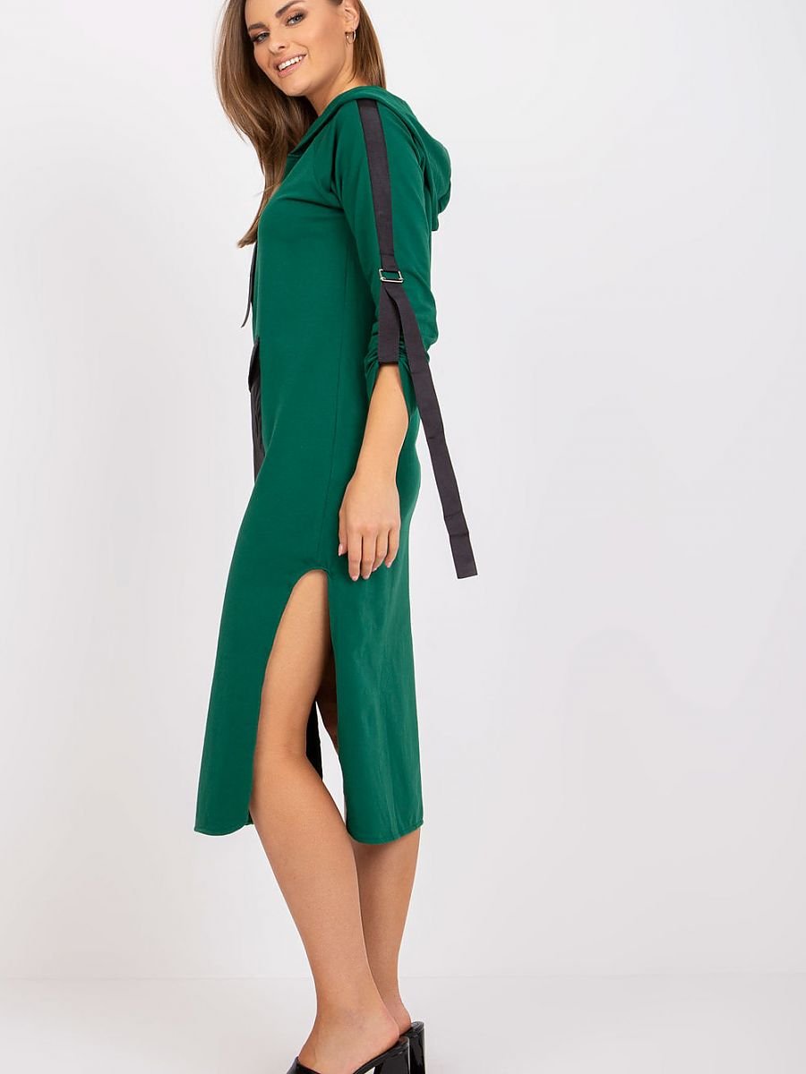 Bluza damska o kroju sukienki z długim rękawem. Sukienka z kapturem, po bokach rozcięcia. Na przodzie naszyta kieszonka. Rękawy z paskami do regulacji.