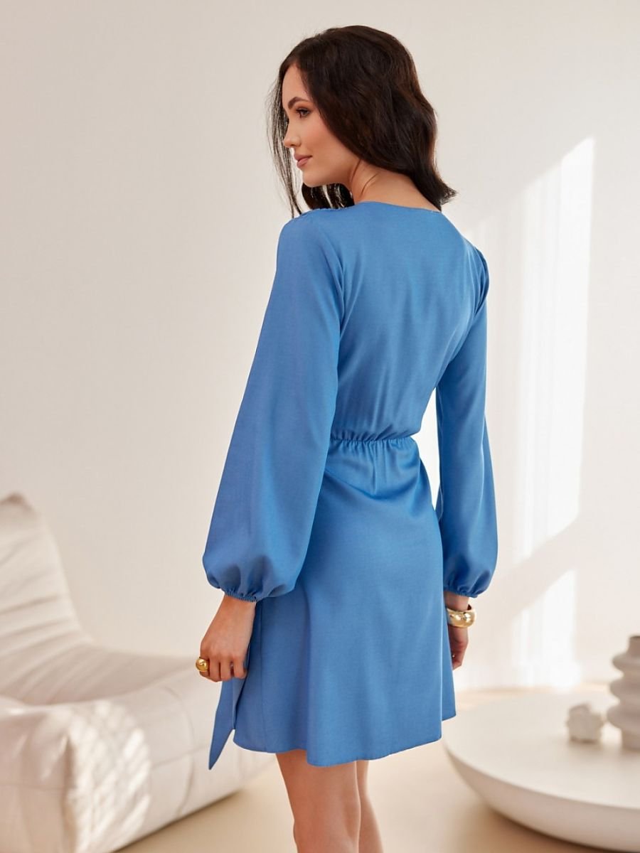Sukienka mini z długimi rękawami. Góra kopertowa, a dół delikatnie rozkloszowany. Nie posiada podszewki, jest zapinana na podwójne wiązanie w pasie.