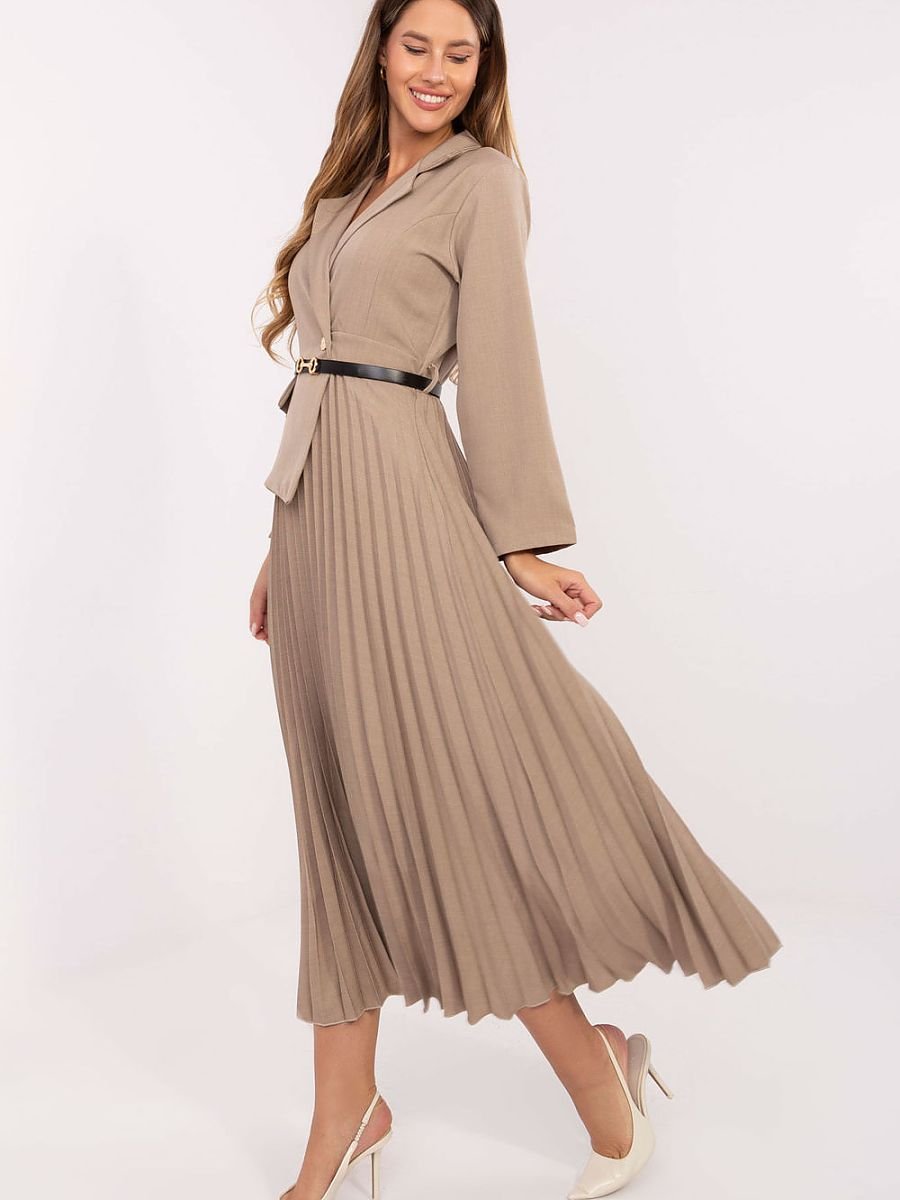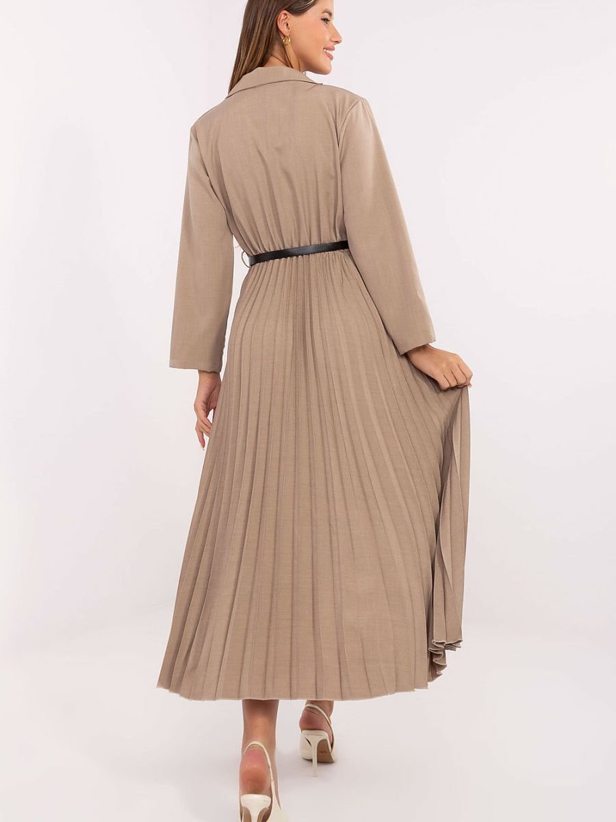 Elegancka sukienka maxi o rozkloszowanym fasonie, idealna zarówno do pracy, jak i na wizytowe okazje. Góra w stylu marynarskim z klasycznym kołnierzykiem i zapięciem na guzik nadaje całości szyku i profesjonalnego charakteru. Od pasa w dół sukienka wykonana jest z plisowanego materiału, który pięknie układa się w ruchu, podkreślając lekkość i kobiecy wdzięk. Długie rękawy dodają elegancji, a zapinany pasek akcentuje talię i nadaje sylwetce proporcji. Całość utrzymana jest w gładkim wykończeniu, a dominująca mieszanka wiskozy i poliestru zapewnia komfort noszenia oraz trwałość materiału.