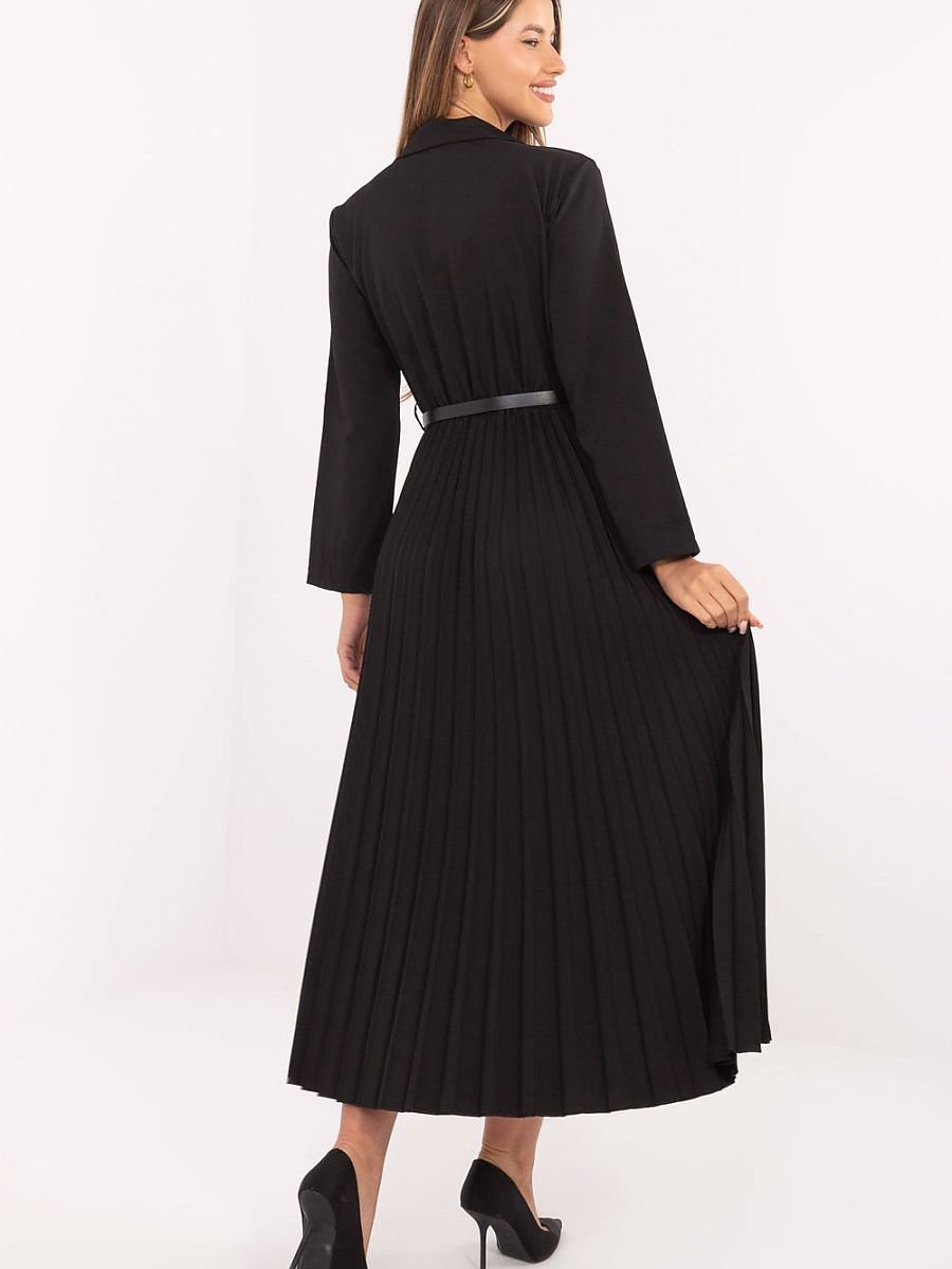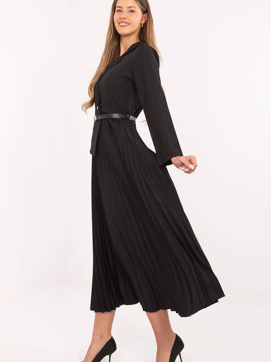 Elegancka sukienka maxi o rozkloszowanym fasonie, idealna zarówno do pracy, jak i na wizytowe okazje. Góra w stylu marynarskim z klasycznym kołnierzykiem i zapięciem na guzik nadaje całości szyku i profesjonalnego charakteru. Od pasa w dół sukienka wykonana jest z plisowanego materiału, który pięknie układa się w ruchu, podkreślając lekkość i kobiecy wdzięk. Długie rękawy dodają elegancji, a zapinany pasek akcentuje talię i nadaje sylwetce proporcji. Całość utrzymana jest w gładkim wykończeniu, a dominująca mieszanka wiskozy i poliestru zapewnia komfort noszenia oraz trwałość materiału.