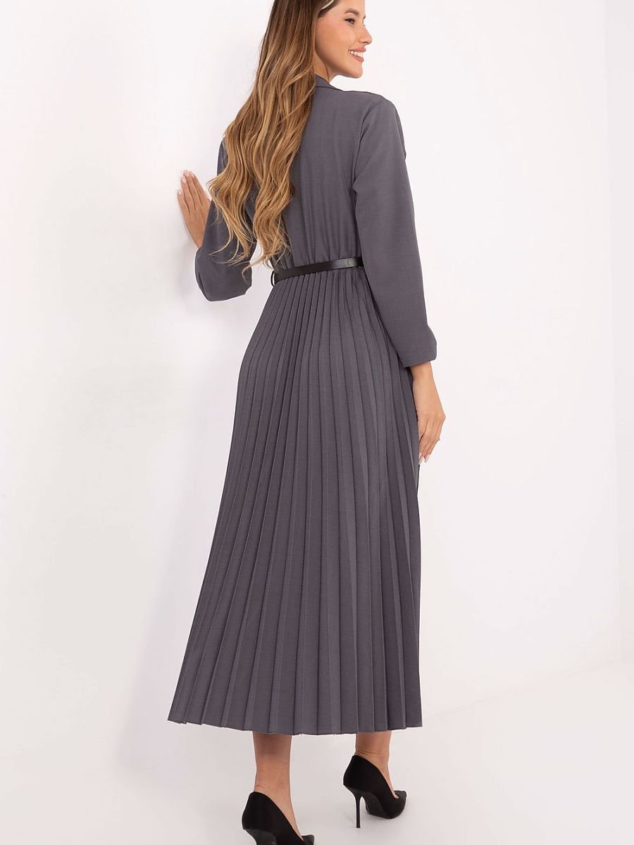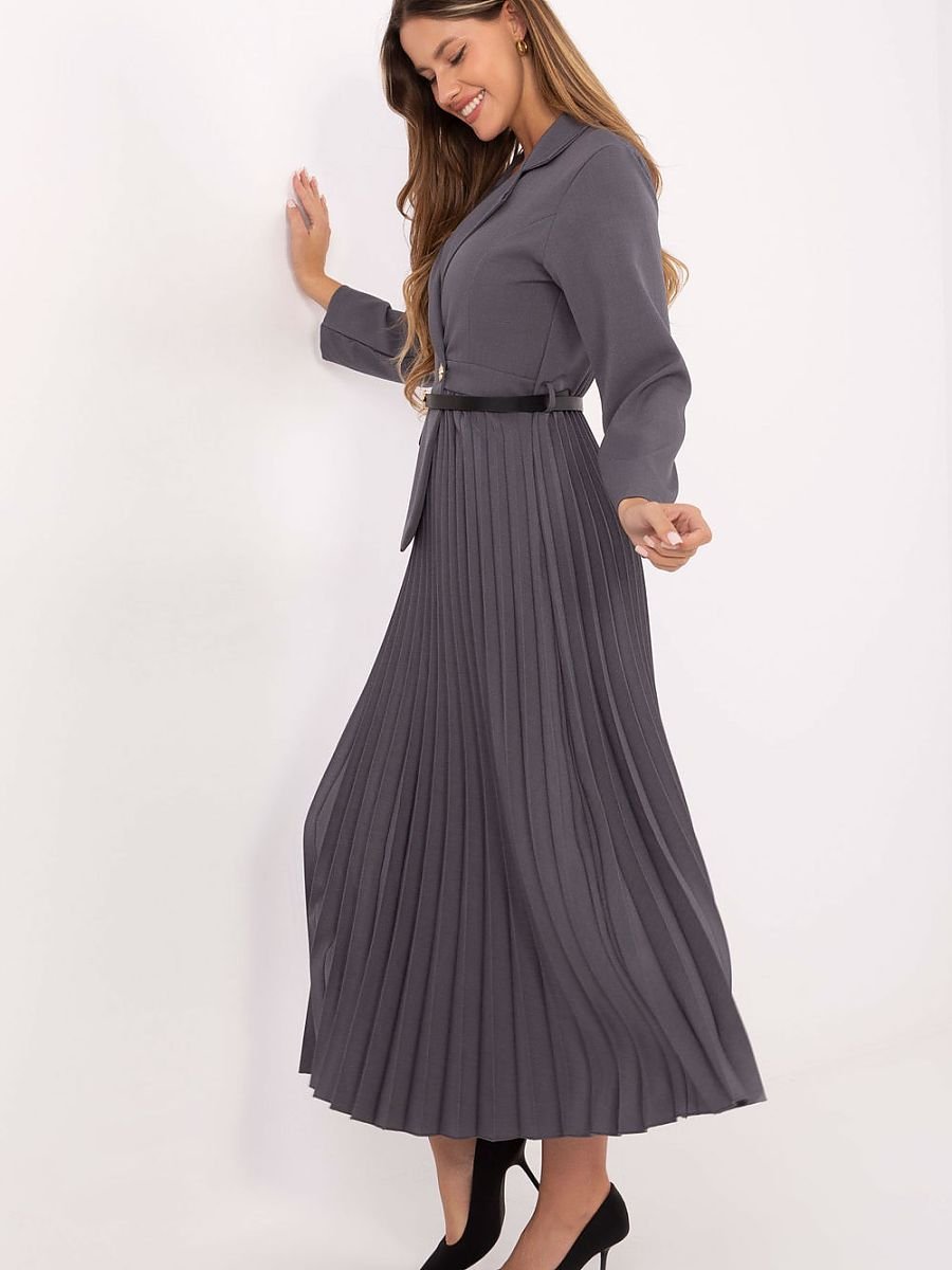 Elegancka sukienka maxi o rozkloszowanym fasonie, idealna zarówno do pracy, jak i na wizytowe okazje. Góra w stylu marynarskim z klasycznym kołnierzykiem i zapięciem na guzik nadaje całości szyku i profesjonalnego charakteru. Od pasa w dół sukienka wykonana jest z plisowanego materiału, który pięknie układa się w ruchu, podkreślając lekkość i kobiecy wdzięk. Długie rękawy dodają elegancji, a zapinany pasek akcentuje talię i nadaje sylwetce proporcji. Całość utrzymana jest w gładkim wykończeniu, a dominująca mieszanka wiskozy i poliestru zapewnia komfort noszenia oraz trwałość materiału.