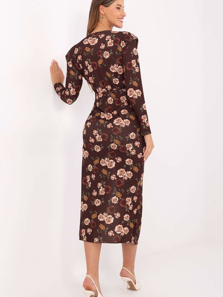 Stylowa sukienka ołówkowa to idealny wybór na wyjątkowe okazje. Wykonana z przyjemnej w dotyku mieszanki wiskozy i poliestru, pięknie układa się na sylwetce, podkreślając kobiece kształty. Model ma długość midi oraz długi rękaw, co nadaje mu klasy i elegancji. Na przodzie znajduje się efektowne rozcięcie sięgające do uda, które subtelnie eksponuje nogę, dodając całości zmysłowego charakteru. Kopertowy dekolt optycznie wysmukla szyję i podkreśla dekolt, a ozdobne marszczenia z metalową ozdobą stanowią elegancki akcent, który przyciąga wzrok. Sukienka w kwiatowy wzór doskonale sprawdzi się na imprezy, przyjęcia i wizytowe okazje, łącząc kobiecość, szyk i wygodę w jednym.
