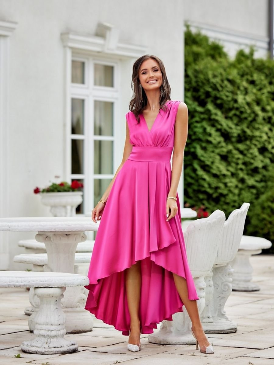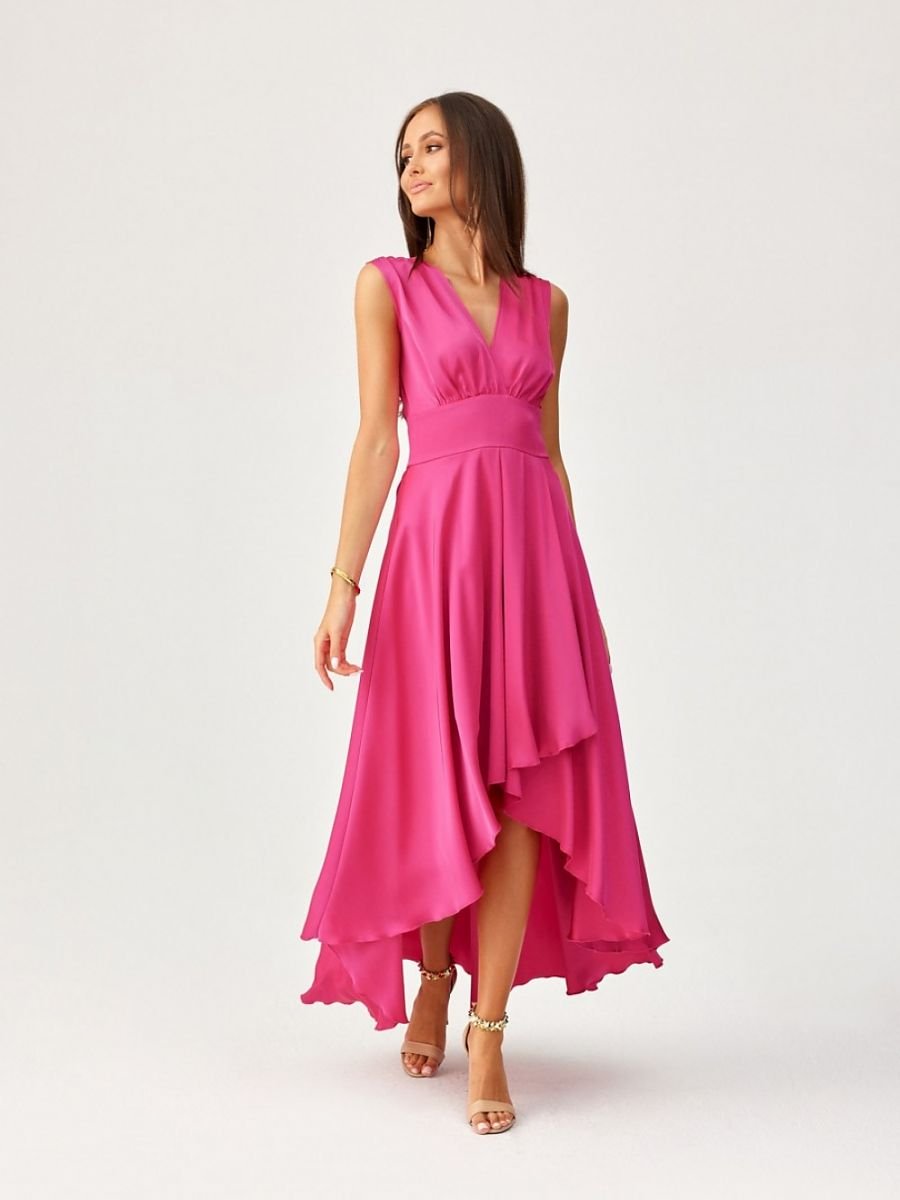 Sukienka maxi wyprodukowana jest z połyskującego satynowego materiału. Jej asymetryczny dół i głęboki dekolt dodają subtelnej kobiecości, a rozkloszowany krój zapewnia swobodę ruchów. Wieczorowa sukienka posiada piękny kopertowy dekolt, który optycznie wydłuży nam sylwetkę oraz pięknie podkreśli biust. Szerokie zwężenie w pasie, które pięknie podkreśli kobiece atuty. Sukienka maxi cechuje się również asymetrycznym krojem, który pozwala na pokazanie nóg. Sukienka zapinana jest na kryty zamek błyskawiczny z tyłu modelu. Produkt jest wyprodukowany i uszyty w Polsce.