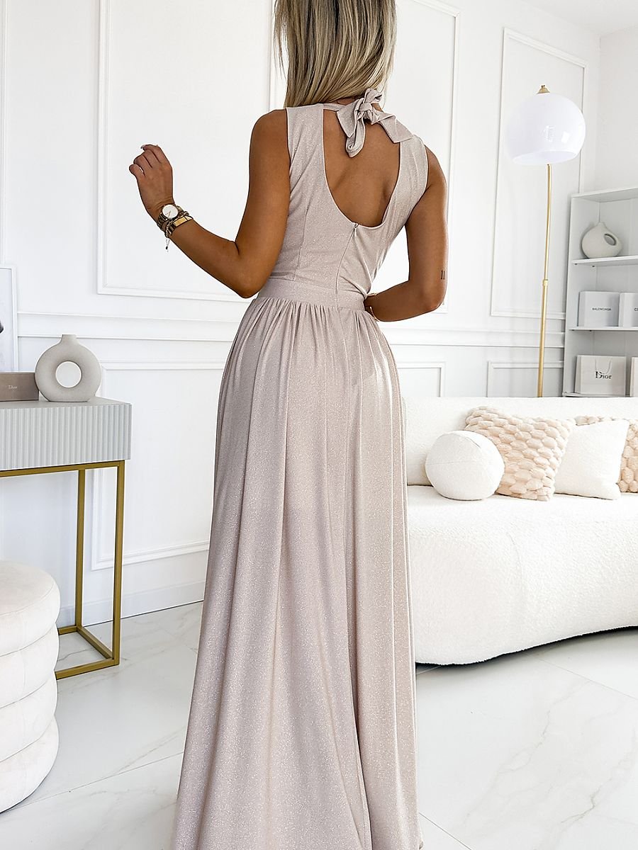 Justine maxi długa suknia z dekoltem, rozcięciem na nogę i wiązaniem na plecach. Uszyta z elastycznego materiału. Sukienka w kolorze beżowym z brokatem. Zapinana z tyłu na kryty zamek. Produkt polski. Marka numoco.