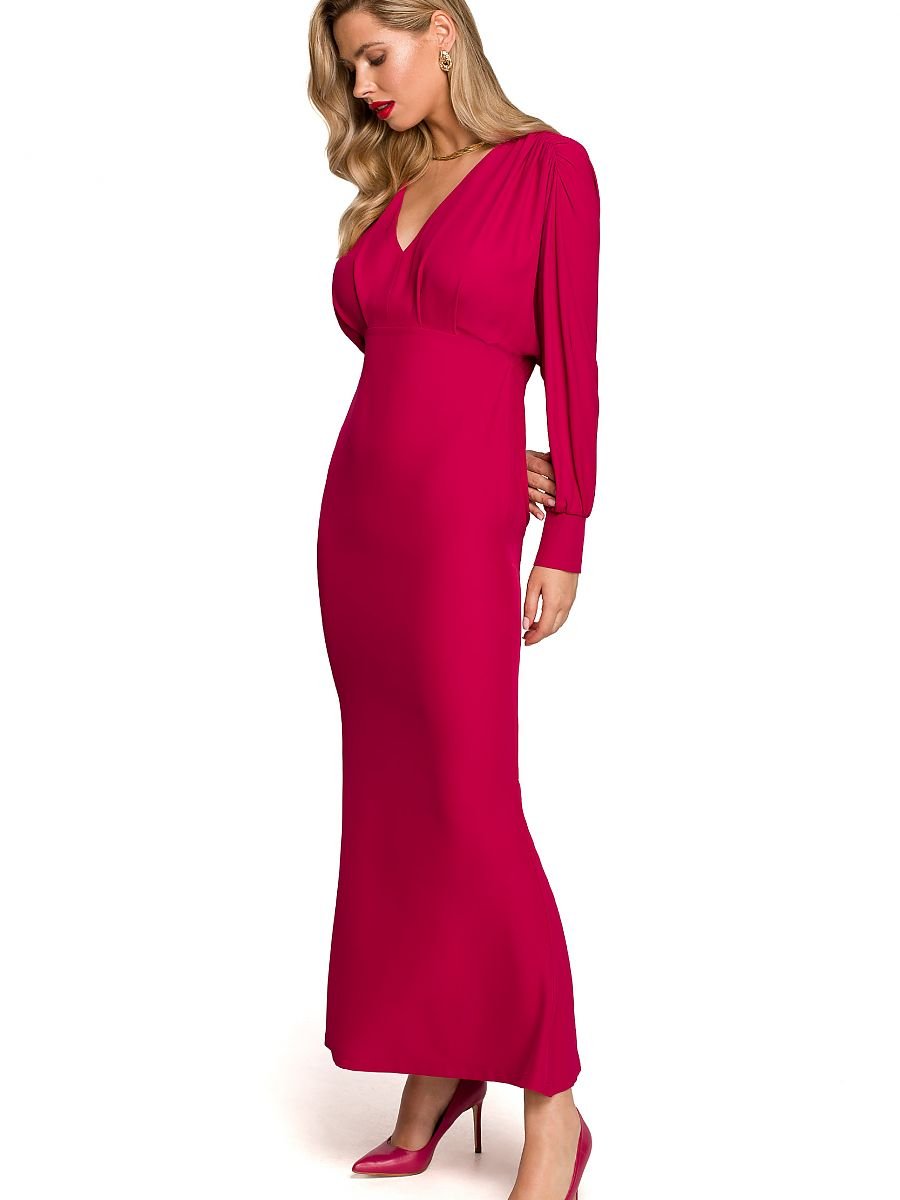 Czarująca i wyjątkowa sukienka na specjalne okazje. Głęboki dekolt i obszerne rękawy zakończone mankietami z oblekanymi guzikami. Spódnica maxi, nadająca subtelny kształt rybki z przykuwającym uwagę rozcięciem z tyłu, sprawia, że zachwyca podczas poruszania się. Sukienka bez podszewki, zapinana na kryty zamek.