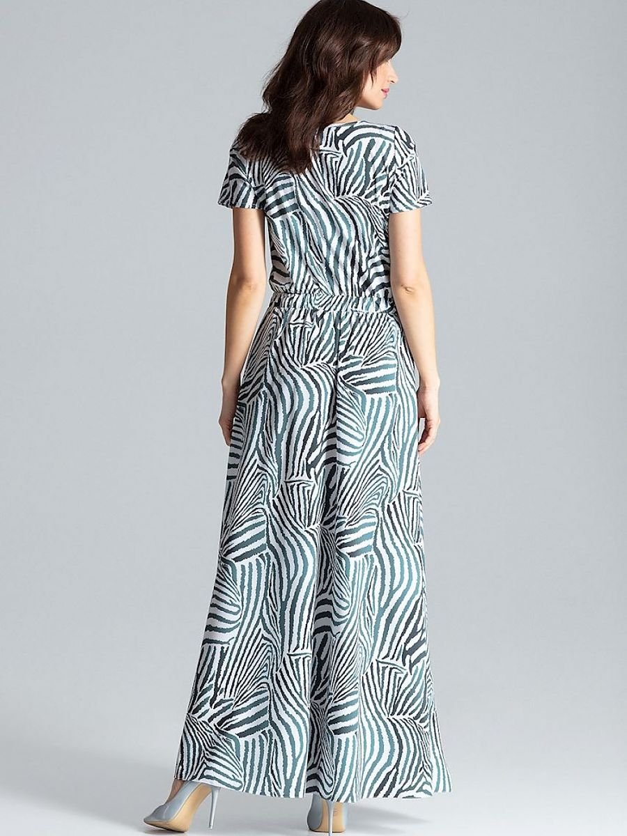 Długa sukienka z krótkimi rękawami. W pasie szeroka guma z podwójnym przeszyciem. Po bokach spódnicy rozcięcia. Sukienka bez zapięcia, kieszeni i podszewki.