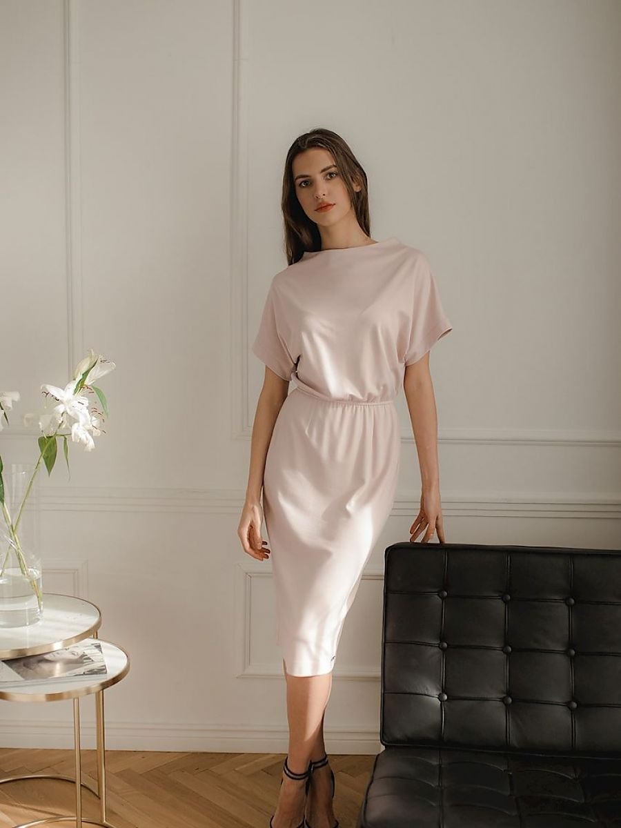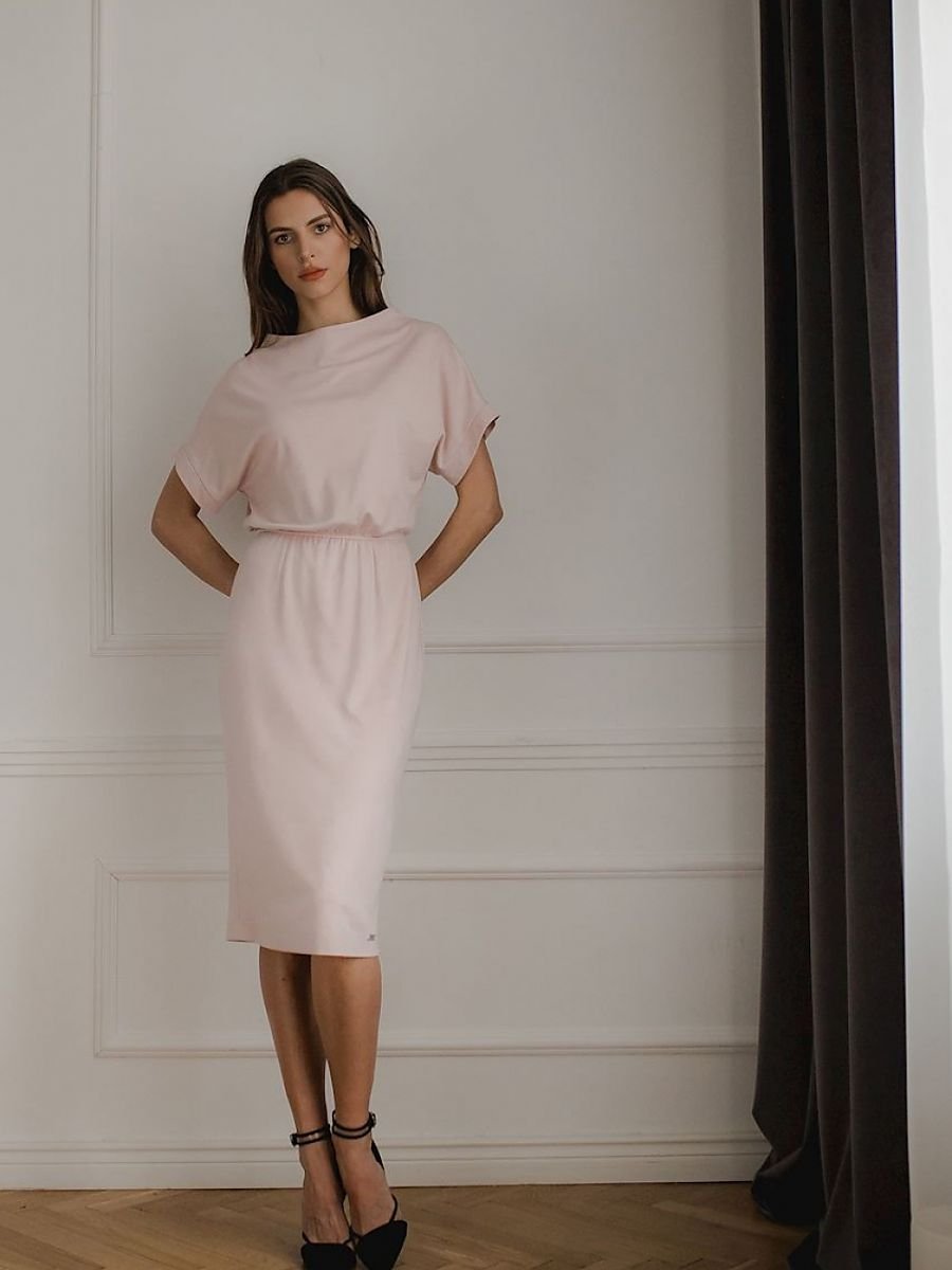 Różowa sukienka midi, krótki opadający na ramię rękaw z mankietem. Półokrągły dekolt. W pasie wszyta guma. Dopasowany dół.