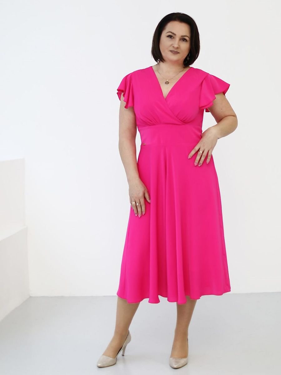 Elegancka sukienka midi o długości za kolano to idealna propozycja na wyjątkowe okazje. Góra w kopertowym kroju pięknie podkreśla dekolt, a dopasowany fason akcentuje talię, nadając sylwetce kobiecy kształt. Zwiewne rękawy dodają lekkości i subtelnego uroku, a wszyta z tyłu gumka zapewnia idealne dopasowanie do figury i komfort noszenia. Sukienka została wykończona podszewką, co podnosi jej jakość i wygodę. Przemyślany krój skutecznie maskuje drobne niedoskonałości, sprawiając, że każda kobieta poczuje się w niej wyjątkowo i pewnie.