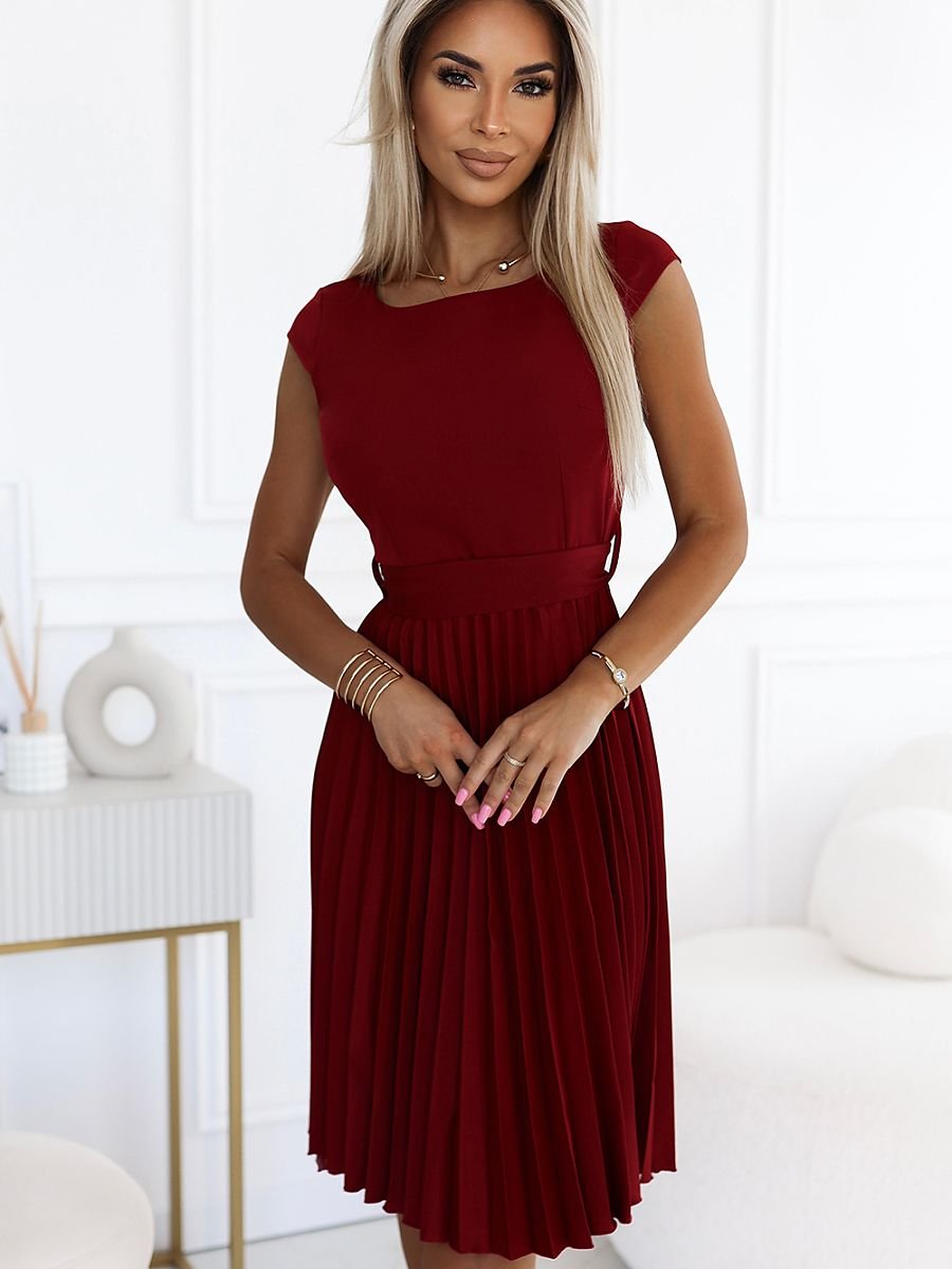 Sukienka Lila marki Numoco to plisowana, elegancka kreacja z krótkim rękawkiem, wykonana w modnym bordowym kolorze. Pasek w talii subtelnie podkreśla sylwetkę, dodając kobiecego uroku, a kryty zamek z tyłu zapewnia komfortowe zakładanie i estetyczny wygląd. To idealna sukienka na formalne i półformalne okazje, która łączy modny design z wygodą noszenia. Produkowana w Polsce, gwarantuje wysoką jakość wykonania i dbałość o detale.