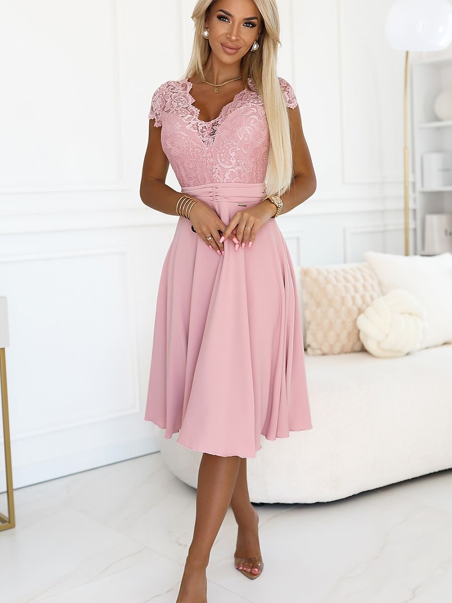 Zachwycająca, kobieca sukienka z koronkową górą i rozkloszowanym dołem to idealna propozycja na wesela, przyjęcia i wyjątkowe okazje. Góra wykonana z delikatnej koronki z krótkim rękawkiem pięknie eksponuje dekolt, natomiast dół z lejącego materiału subtelnie podkreśla talię i nadaje lekkości całej stylizacji. Romantyczny kolor pudrowego różu podkreśla urodę i dodaje wdzięku każdej kobiecie. Sukienka doskonale sprawdzi się jako kreacja na wesele, komunię, randkę lub eleganckie wyjście.