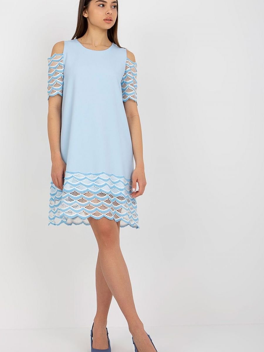 Sukienka koktajlowa z krótkim ażurowym rękawkiem oraz okrągłym dekoltem. Dół sukienki obszyty ażurowym zdobieniem.