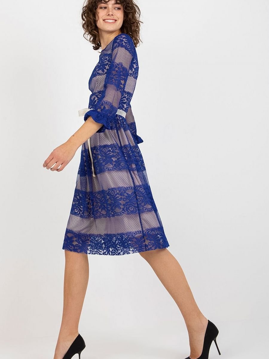 Koronkowa sukienka z rękawem 3/4, zapinana na kryty zamek. Sukienka posiada podszewkę, w talii szarfa do wiązania.