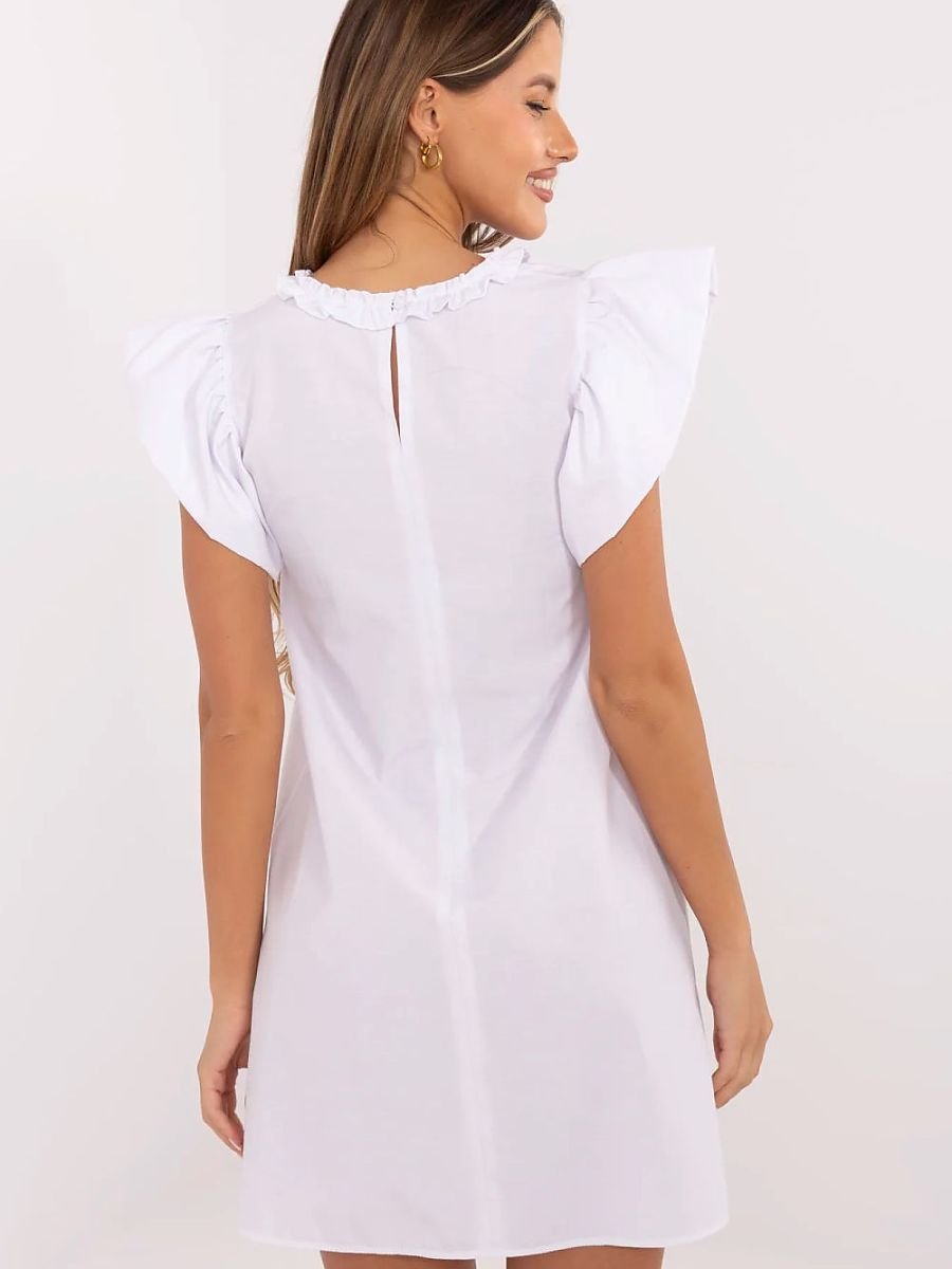 Letnia sukienka o rozkloszowanym fasonie to idealna propozycja na ciepłe dni zarówno na co dzień, jak i do pracy. Wykonana z przewiewnej, dominującej bawełny, zapewnia komfort noszenia i swobodę ruchów przez cały dzień. Model o długości przed kolano prezentuje się kobieco i lekko, a subtelne detale dodają mu uroku. Krótkie rękawy w formie falbanek nadają sukience romantycznego charakteru, a okrągły dekolt wykończony drobną falbanką podkreśla jej delikatny styl. Brak zapięcia sprawia, że sukienka jest niezwykle wygodna i łatwa do założenia. Gładki wzór sprawia, że sukienka jest uniwersalna i łatwa do stylizacji, świetnie komponuje się z lekkimi sandałkami, balerinami czy torebką typu koszyk. To must-have w letniej garderobie każdej kobiety.