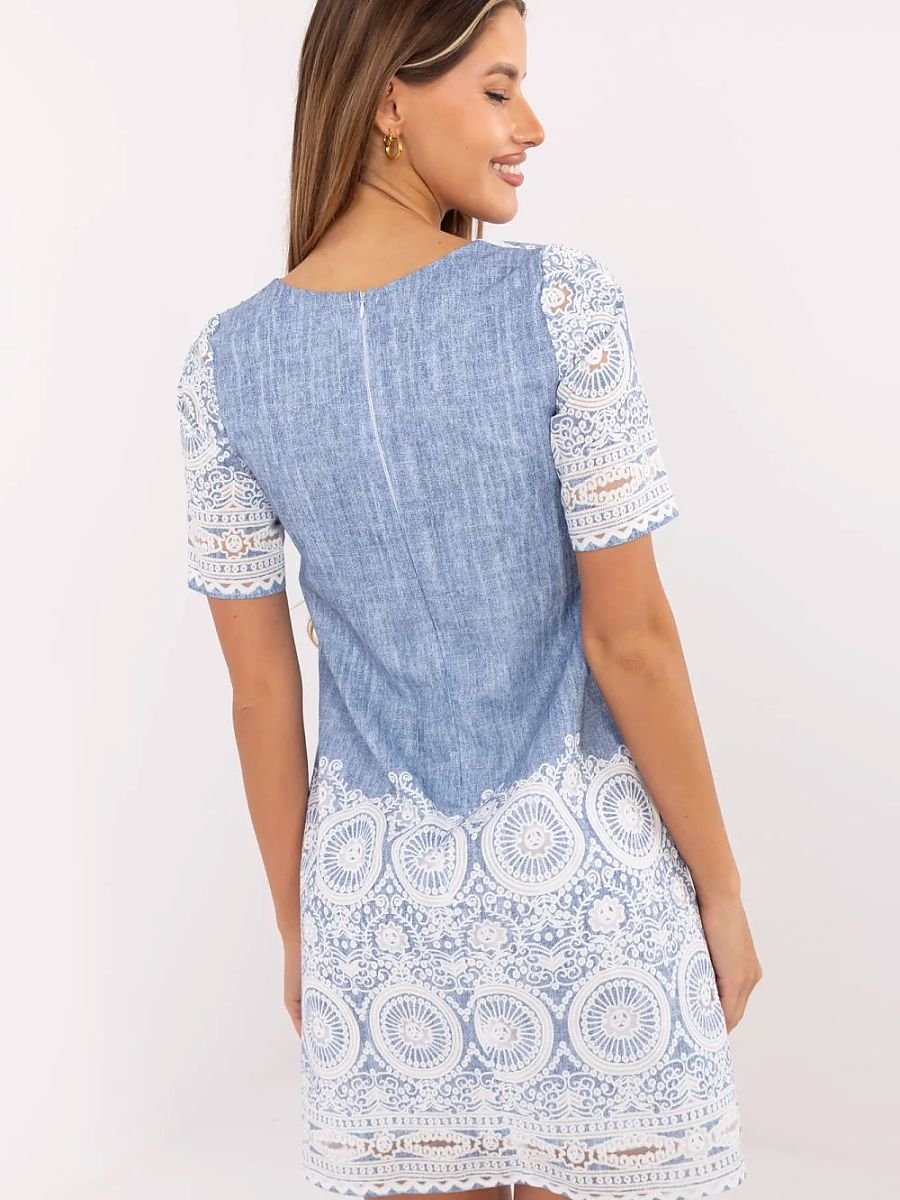 Elegancka sukienka z subtelnym nadrukiem w dolnej części oraz na rękawach to doskonała propozycja na wizytowe okazje i stylowe stylizacje do pracy. Wykonana z dominującego lnu, zapewnia naturalną przewiewność i komfort noszenia, a jednocześnie prezentuje się wyjątkowo szykownie. Model o długości przed kolano z krótkim rękawem i klasycznym, okrągłym dekoltem tworzy zrównoważoną i elegancką sylwetkę. Sukienka została wyposażona w praktyczne zapięcie na kryty zamek, co ułatwia zakładanie i podkreśla estetyczne wykończenie całości. Dodatkowym atutem jest podszewka, która zwiększa komfort i zapobiega prześwitywaniu materiału. Dekoracyjny nadruk dodaje sukience charakteru, zachowując jednocześnie elegancki, stonowany styl. To idealna propozycja dla kobiet ceniących jakość, klasę i subtelne detale.