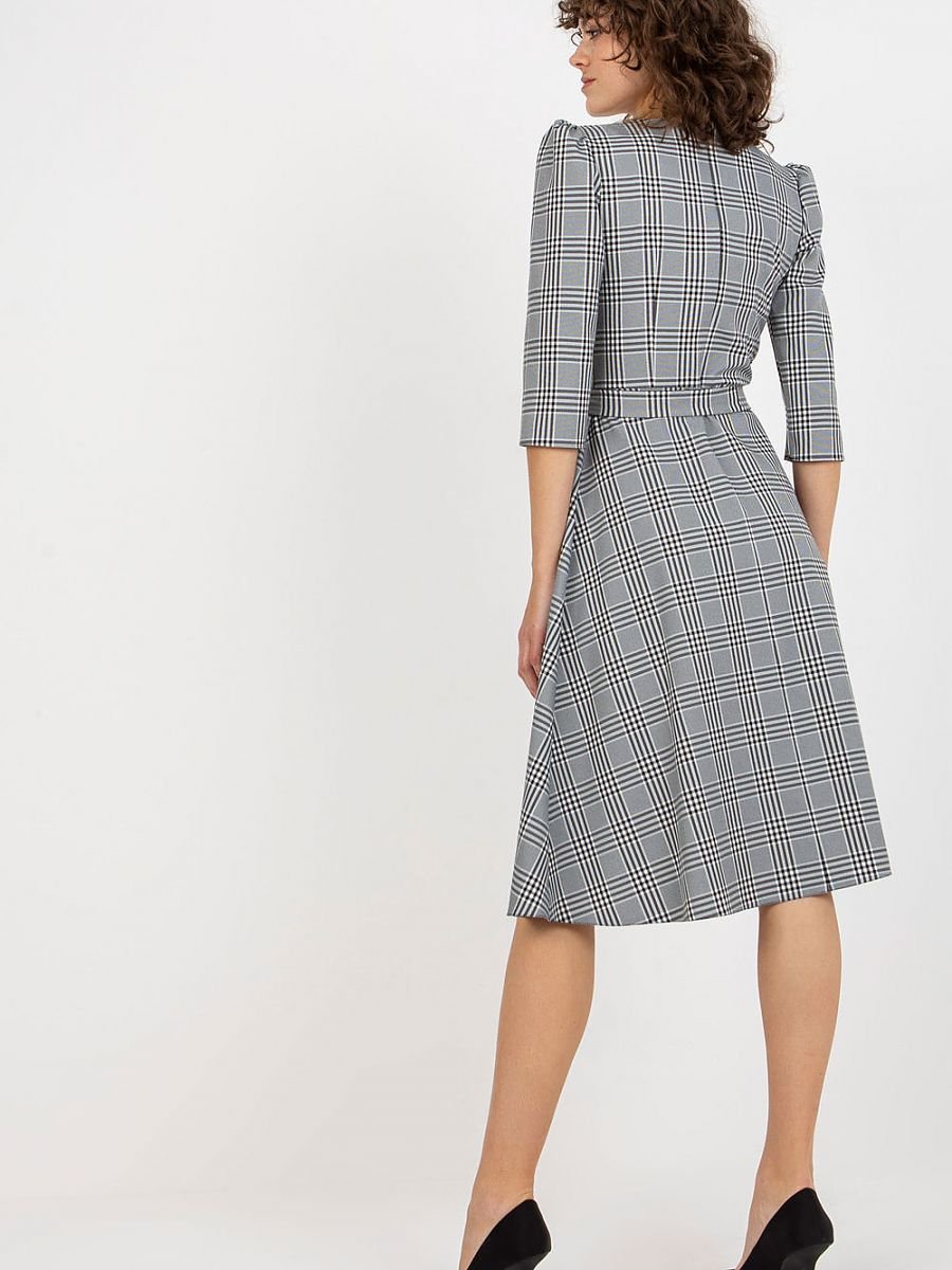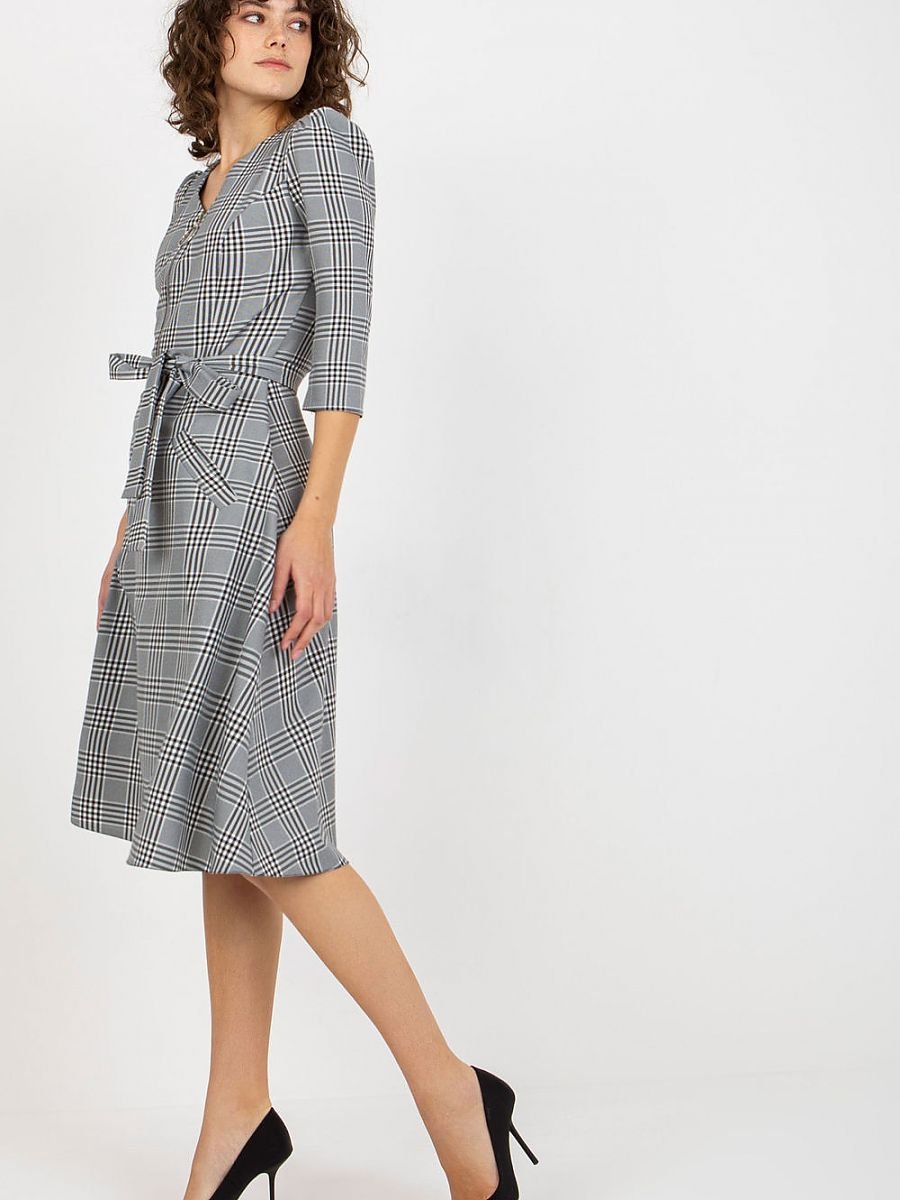 Sukienka w kratę, zapinana na zamek z wiązaniem w pasie. Sukienka z rękawem 3/4 oraz kieszeniami wsuwanymi.