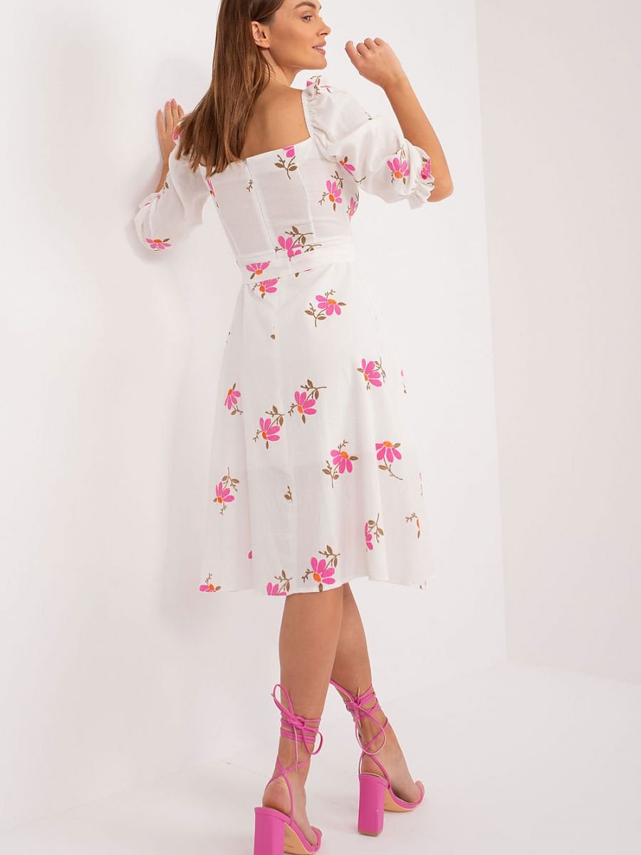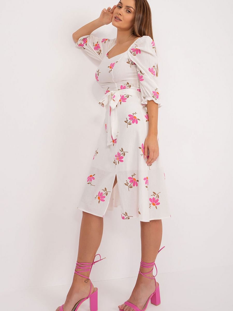 Ta letnia sukienka to idealny wybór na codzienne stylizacje, emanując świeżością i lekkością. Jej rozkloszowany fason sprawia, że jest nie tylko wygodna, ale także bardzo kobieca. Wykonana z lekkiego materiału z nadrukowanymi kwiatami, ta sukienka ma długość midi, co sprawia, że jest odpowiednia na różne okazje od spacerów po plaży po letnie brunch’e. Krótki rękaw i dekolt prostokątny dodają uroku i lekkości, jednocześnie pozwalając na swobodę ruchów. Zapięcie na kryty zamek sprawia, że sukienka jest łatwa w zakładaniu i zdejmowaniu. Dodatkowo, pasek do wiązania podkreśla talię, nadając sylwetce kobiecy kształt. Bufiasty rękaw z falbanką nadaje sukience romantycznego uroku, podkreślając letnią atmosferę. Niezwykle praktycznym dodatkiem jest także podszewka, która zapewnia komfort noszenia i dodatkową warstwę ochrony. W tej sukience poczujesz się zarówno kobieco, jak i swobodnie, gotowa na letnie przygody każdego dnia.