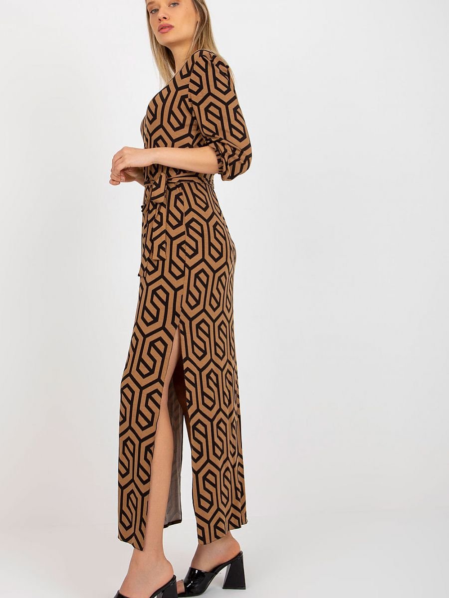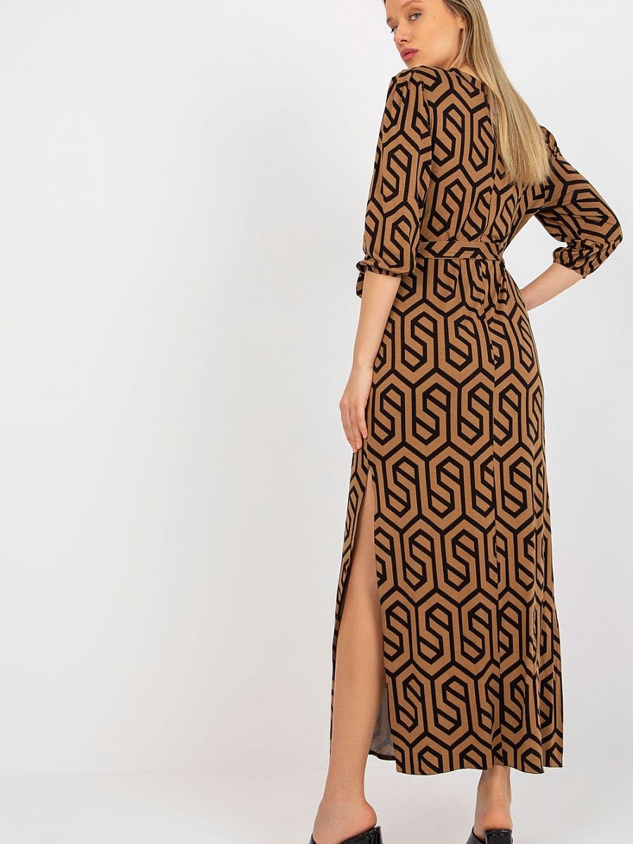 Długa sukienka z rękawem 3/4 oraz dekoltem w serek. U dołu swobodne rozcięcia, do kompletu pasek do wiązania.